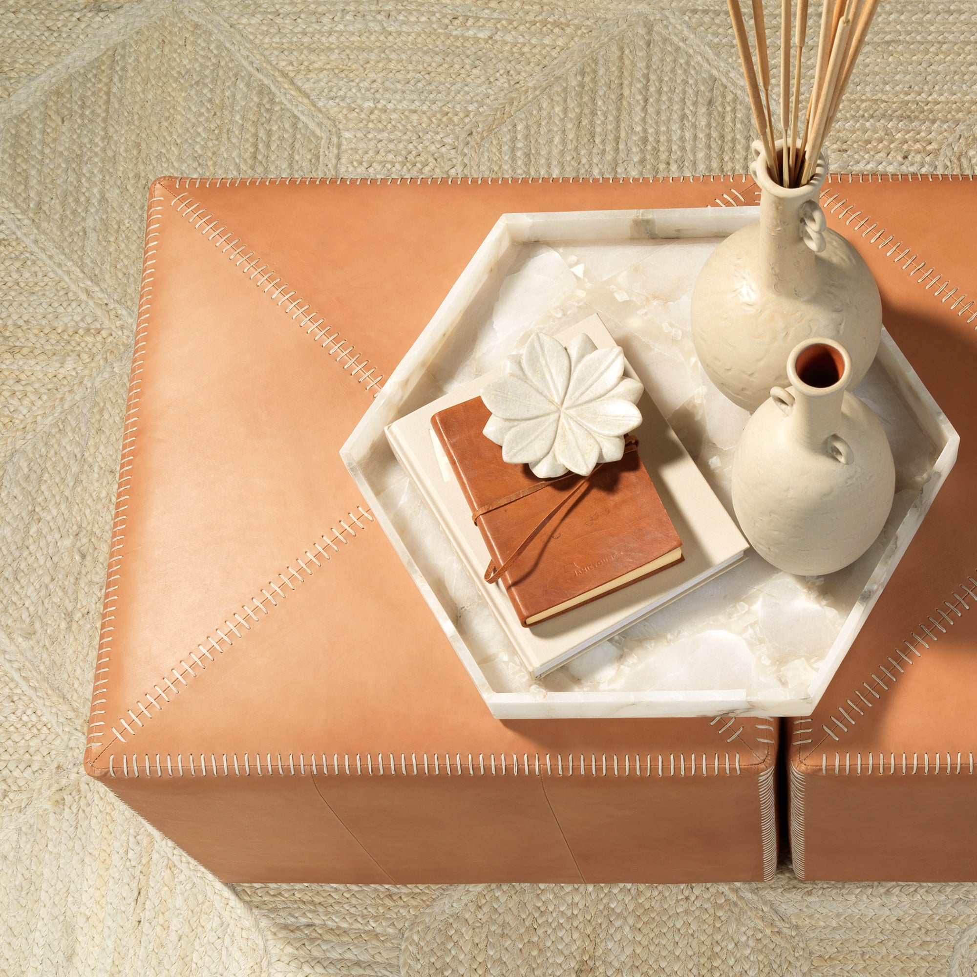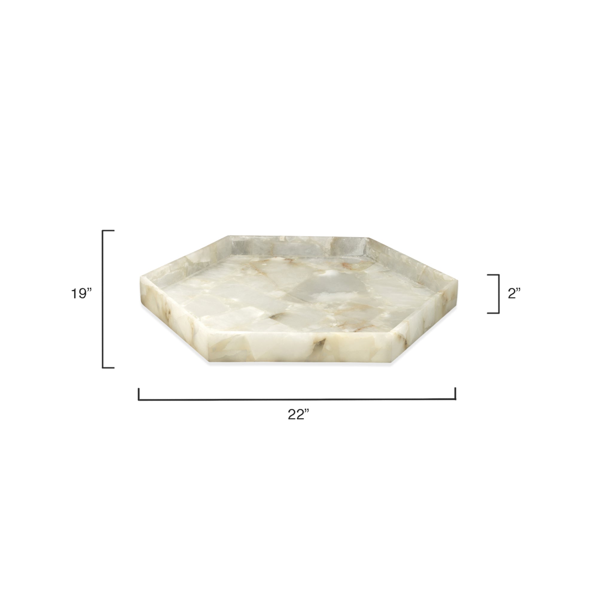 Our alabaster tray is a favorite for bathrooms, living rooms, entryways and bedrooms. The organic cut pieces of alabaster are placed together to create a flat surface and rim to display and contain its contents, from candles and books to perfumes and tissues. The hand-polished finish beautifully reveal rich veining and tonal variations, making each piece one-of-a-kind.