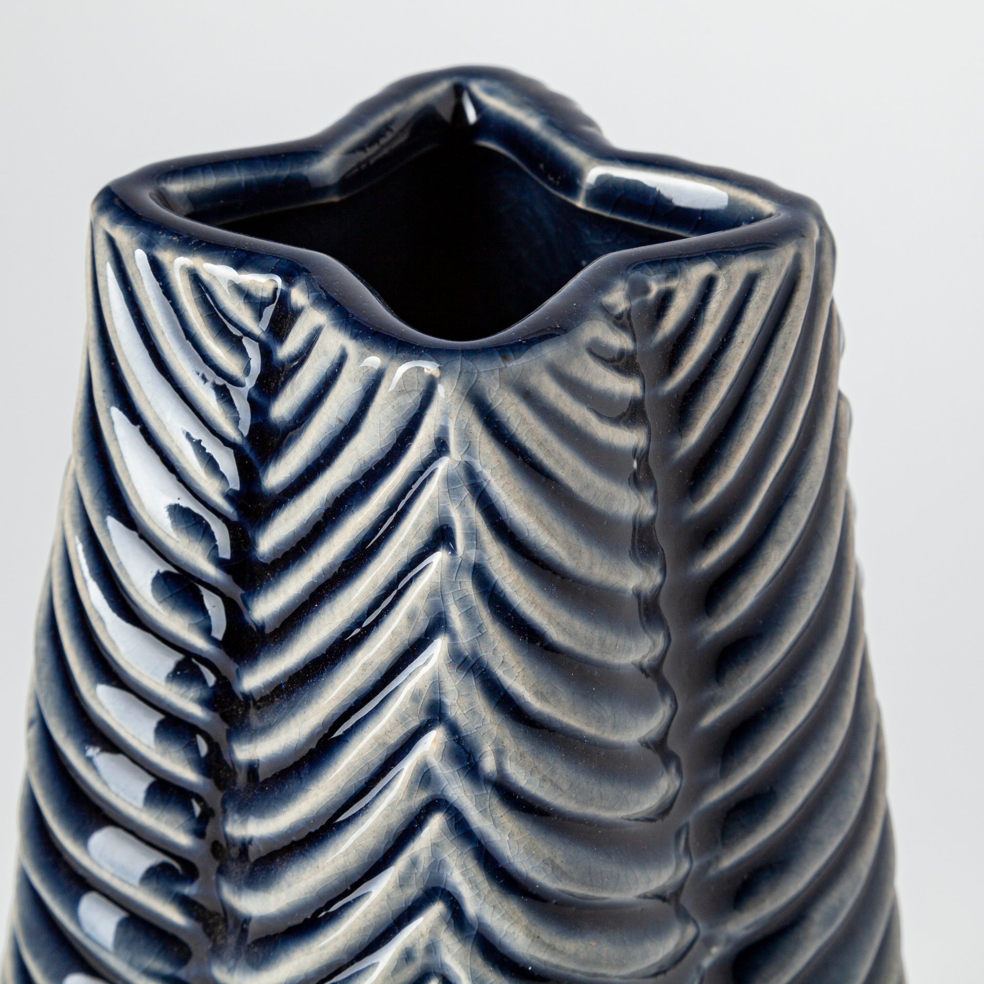 The Bashir is finished in a spectacular high gloss, navy tone with an intricate, grooved pattern on it, making it a stunning vase that is sure to turn heads