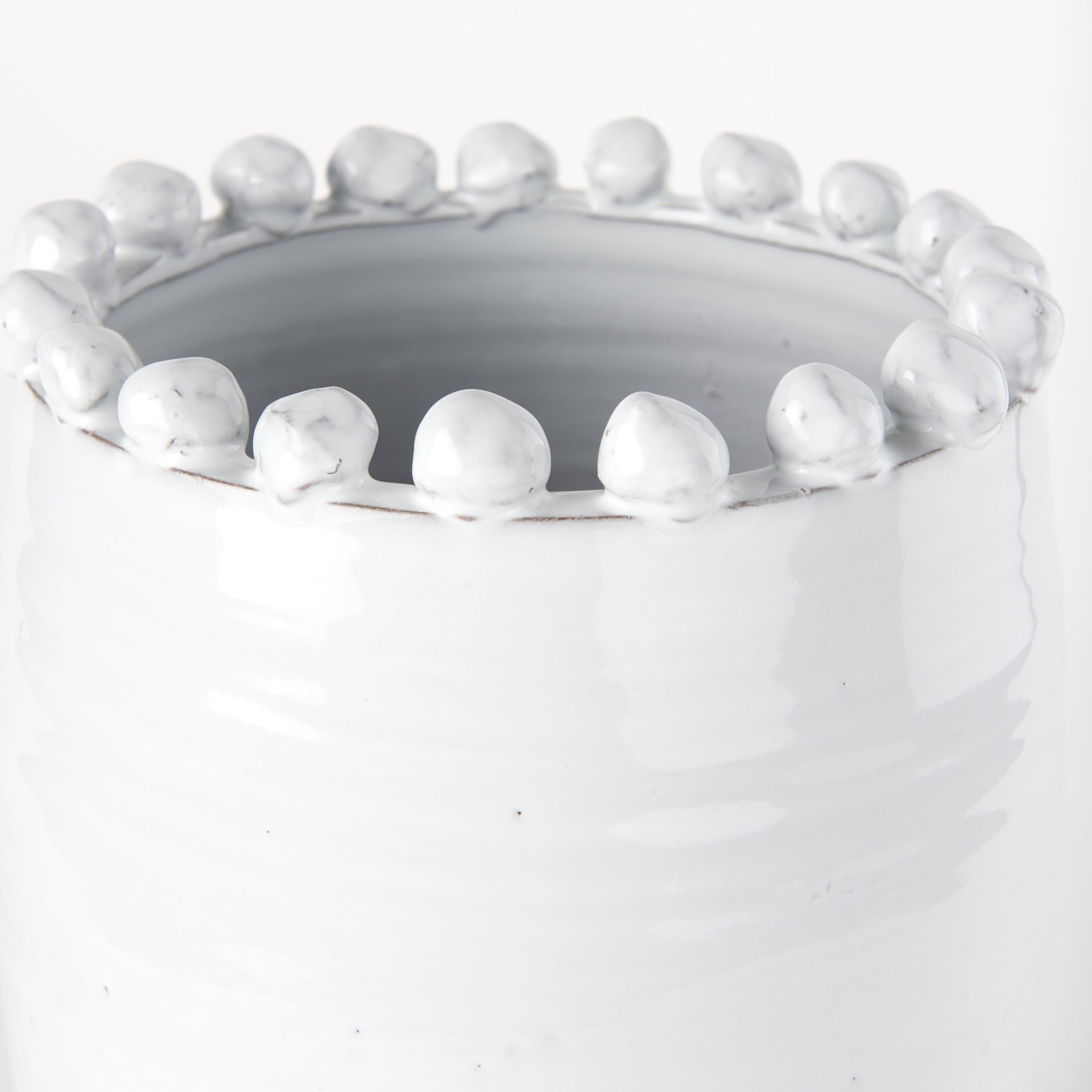 Basin is a beautiful glazed terracotta vase that makes a lovely decor piece or can be functional and host bouquets of flowers or kitchen utensils. It has an off-white finish with handmade terracotta ball accents circling the top rim.