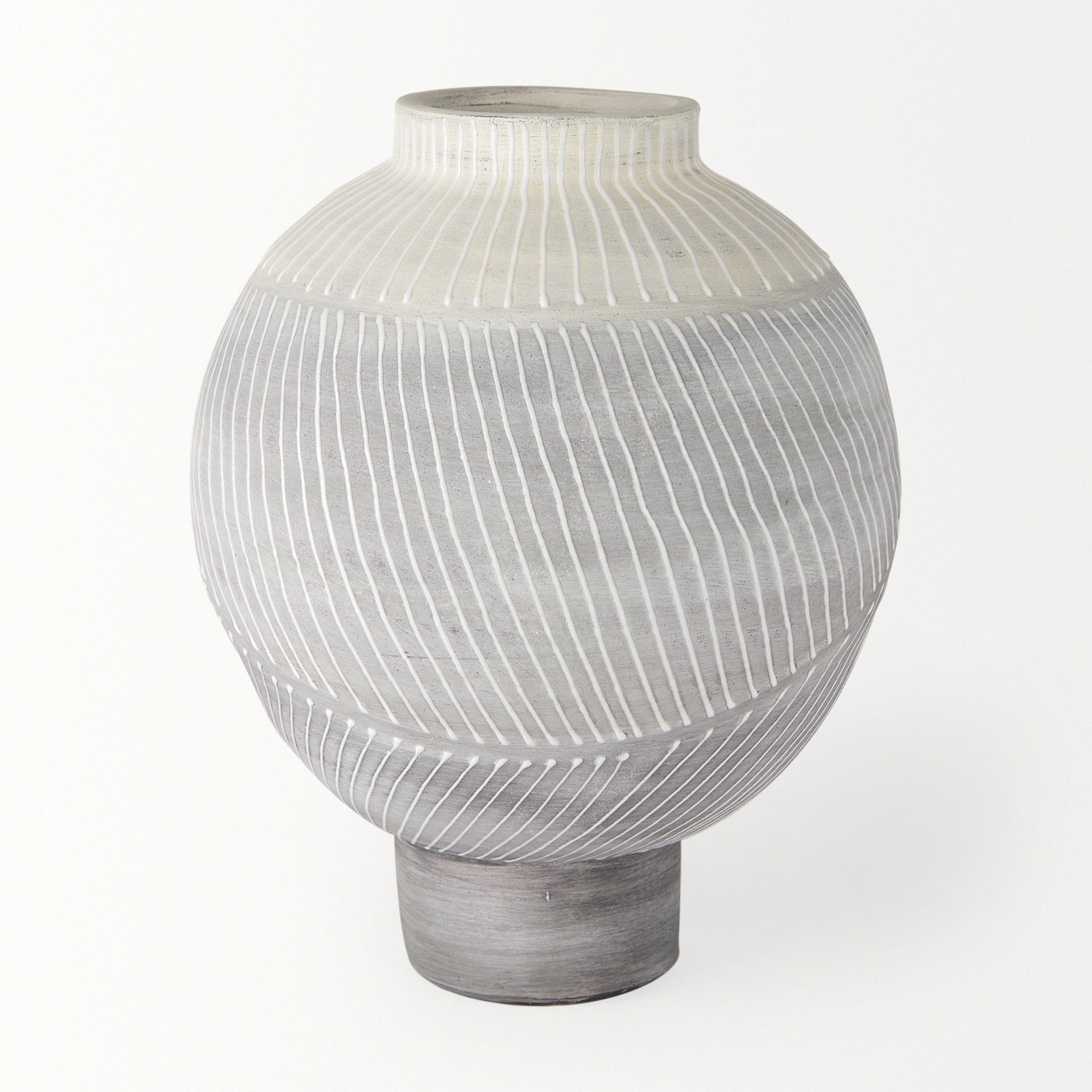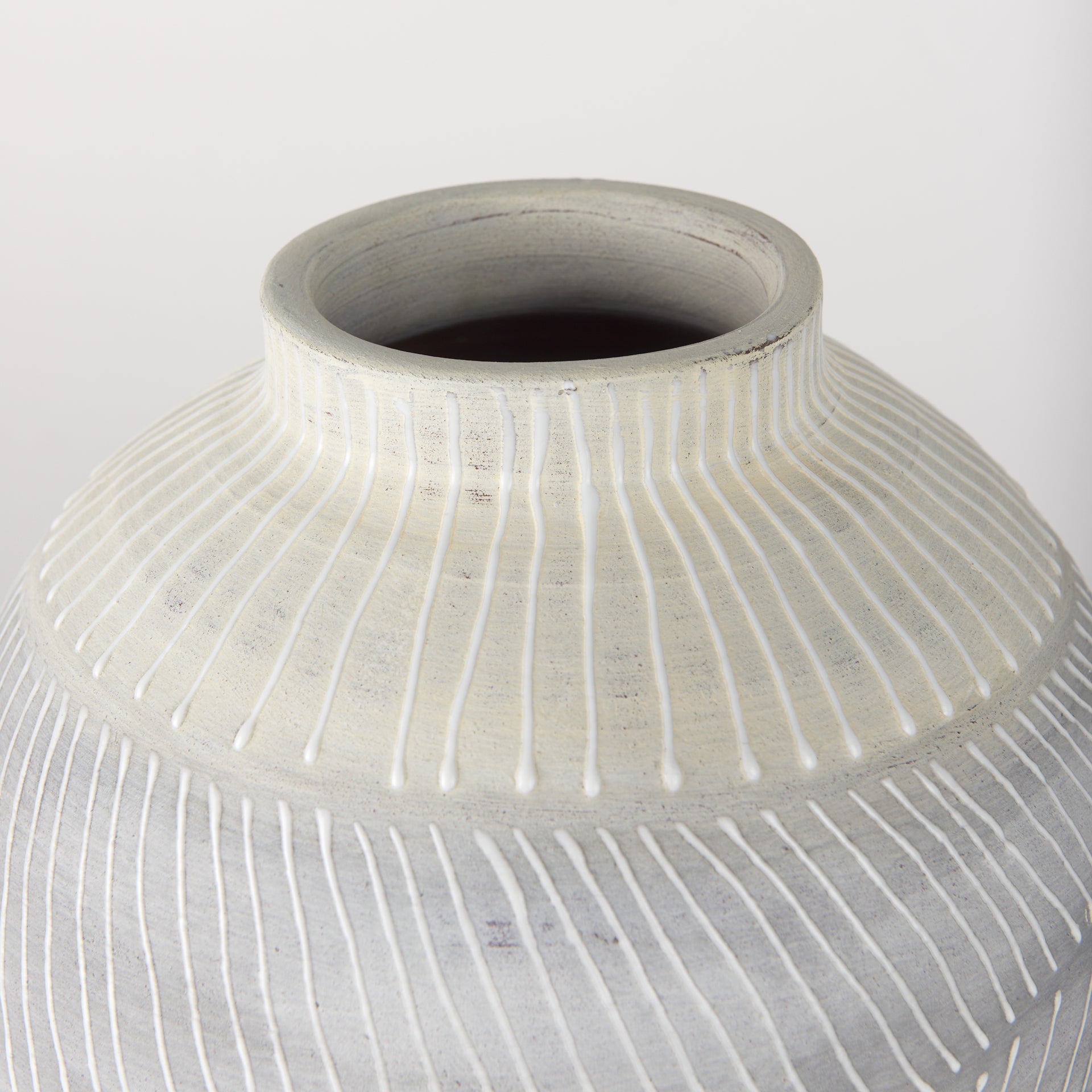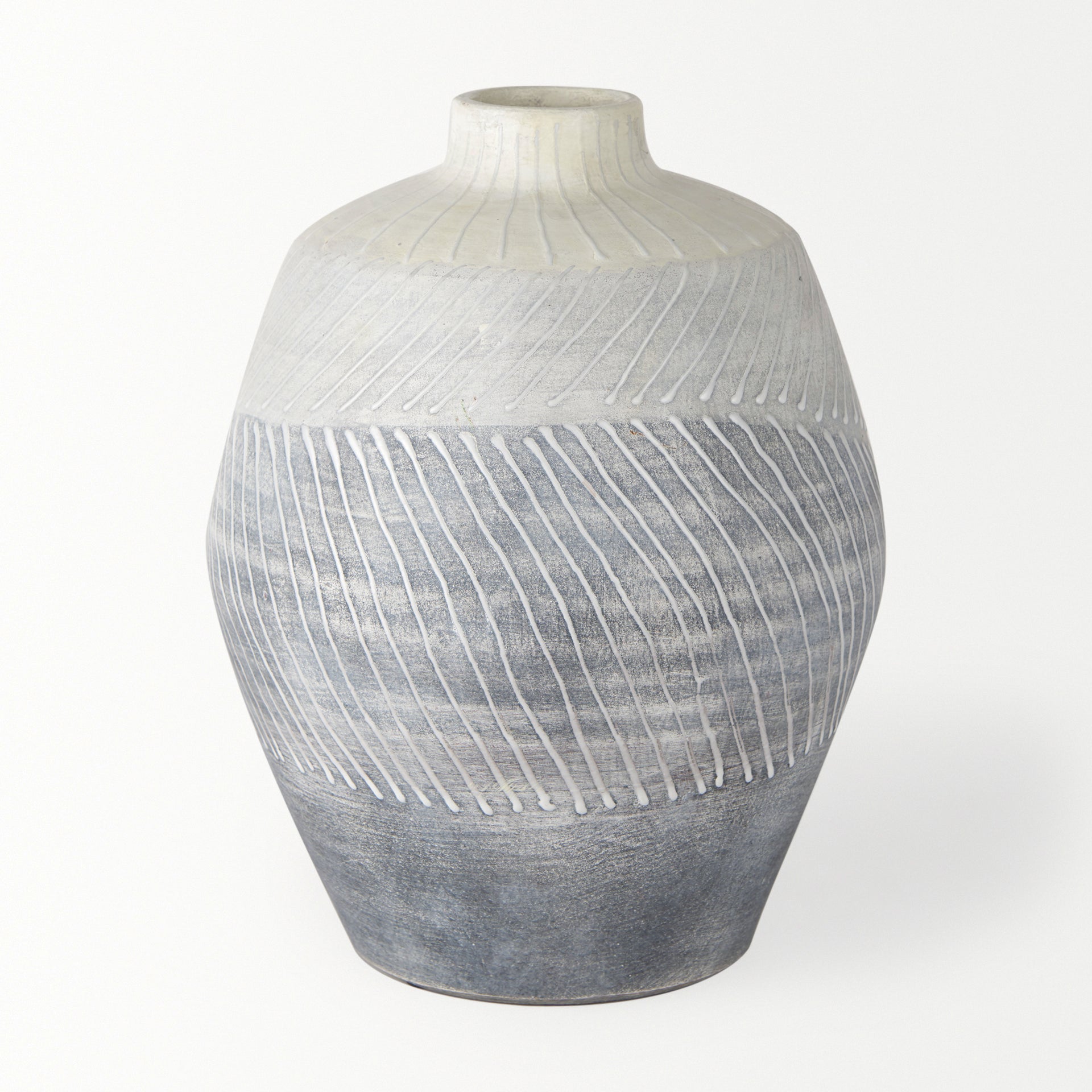 A smooth vase with cream and blue-grays ombre color blocks that have a unique glossy white dimensional line pattern that changes direction with each shade.
