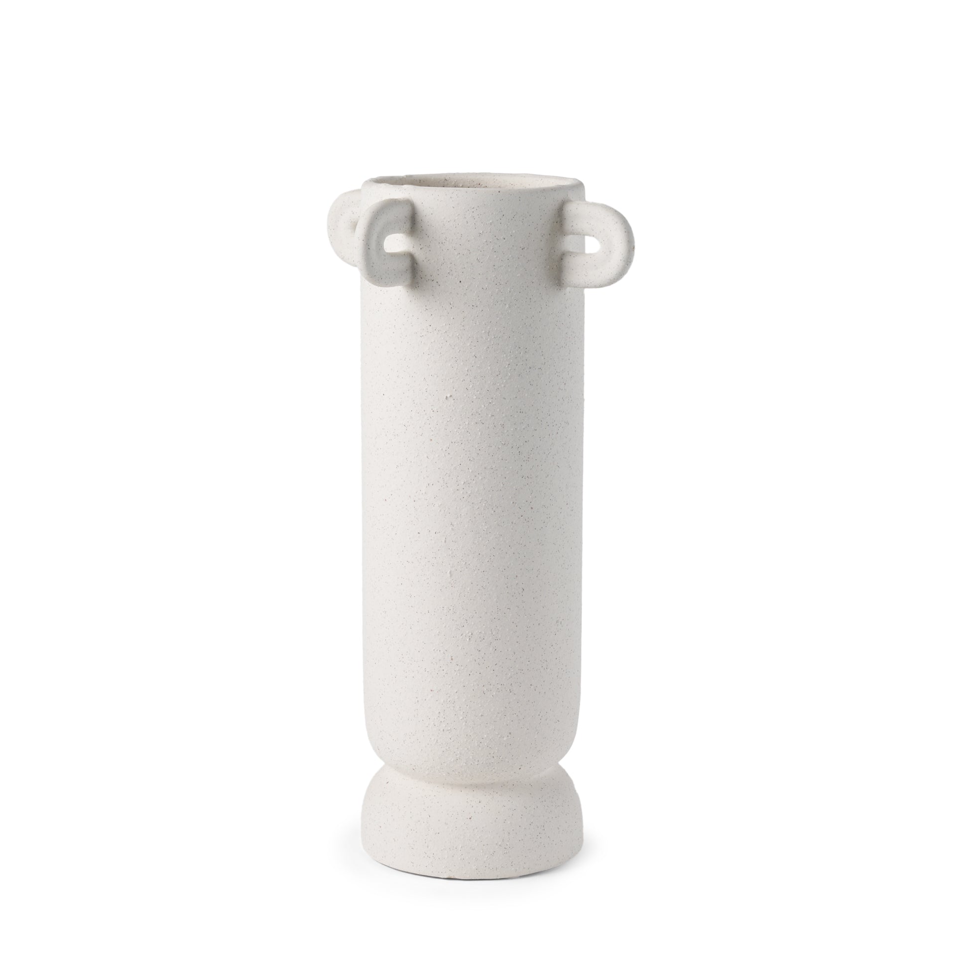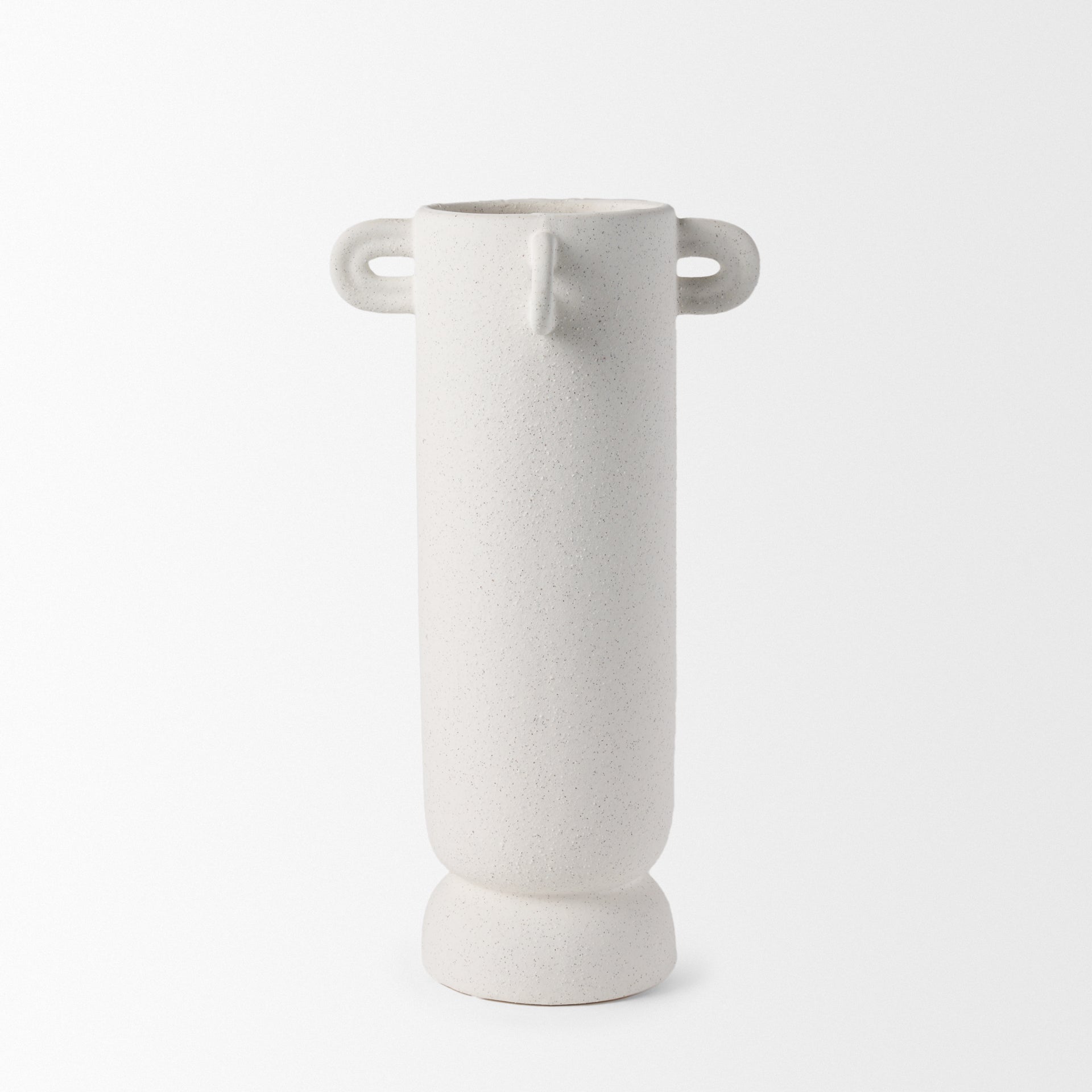 The Dylan Vase, crafted from ceramic, features a gritty textured off-white finish. Each vase is adorned with delicate black speckling, enhancing its tactile appeal, and features two decorative butterfly wing handles for a touch of charm. Its smooth glazed interior ensures durability while providing a watertight vessel for displaying floral and arrangements. Ideal for styling alone or with botanicals, this vase is available in two sizes for a coordinated aesthetic.
