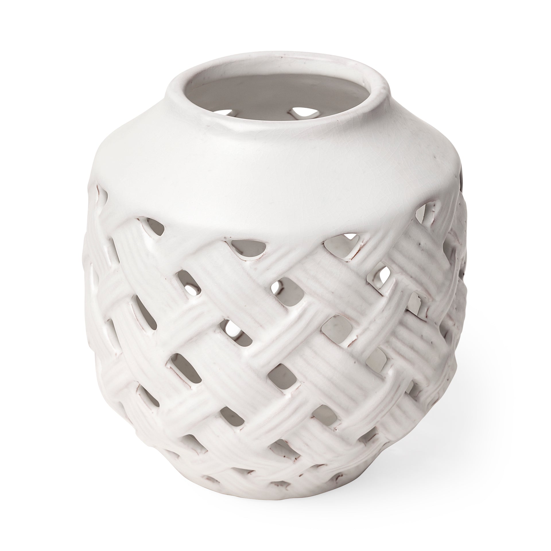 This decorative white ceramic vase showcases a delicate lattice texture and glossy glaze, giving it a refined, elegant appeal. Its short stature makes it ideal for small spaces or as part of a layered decor arrangement.