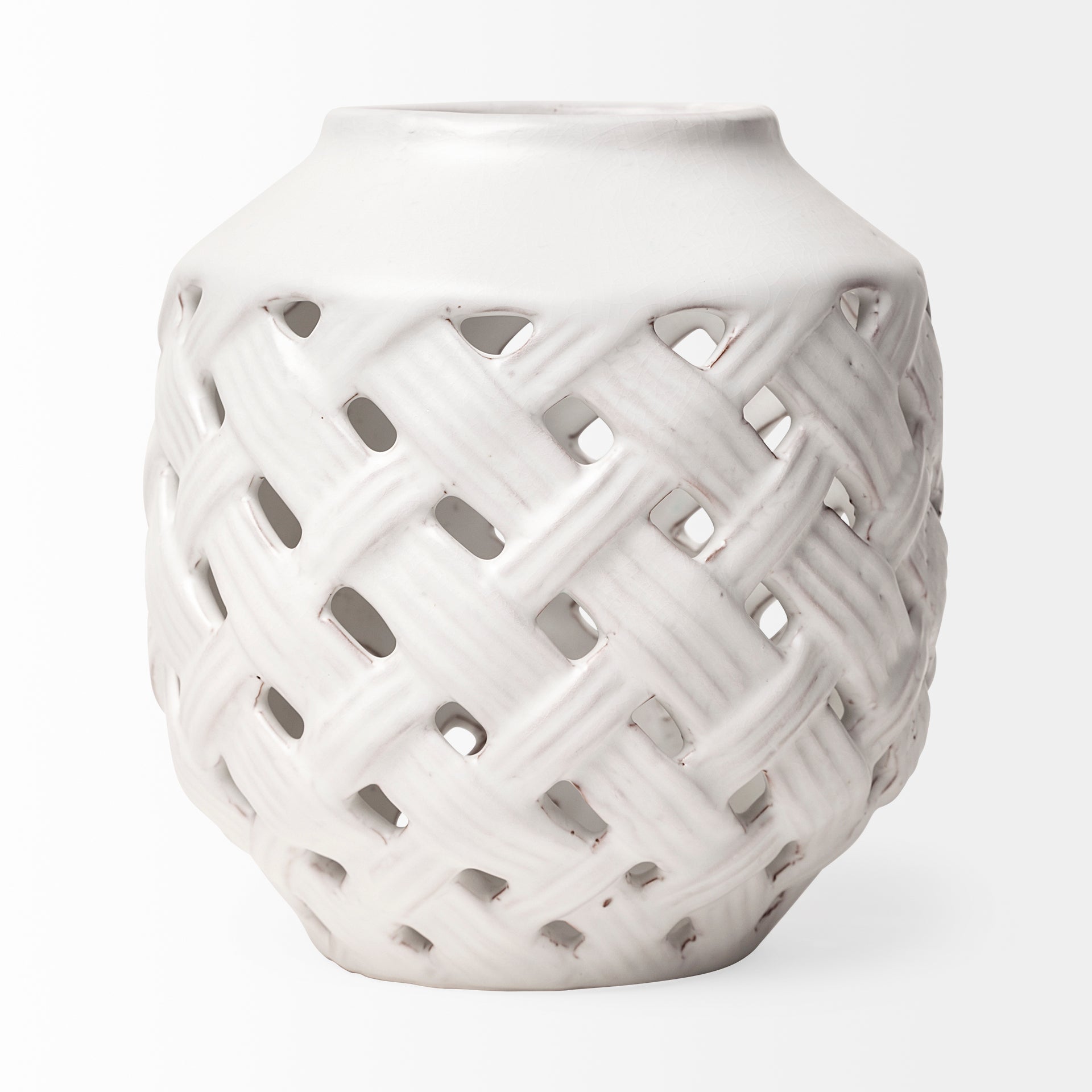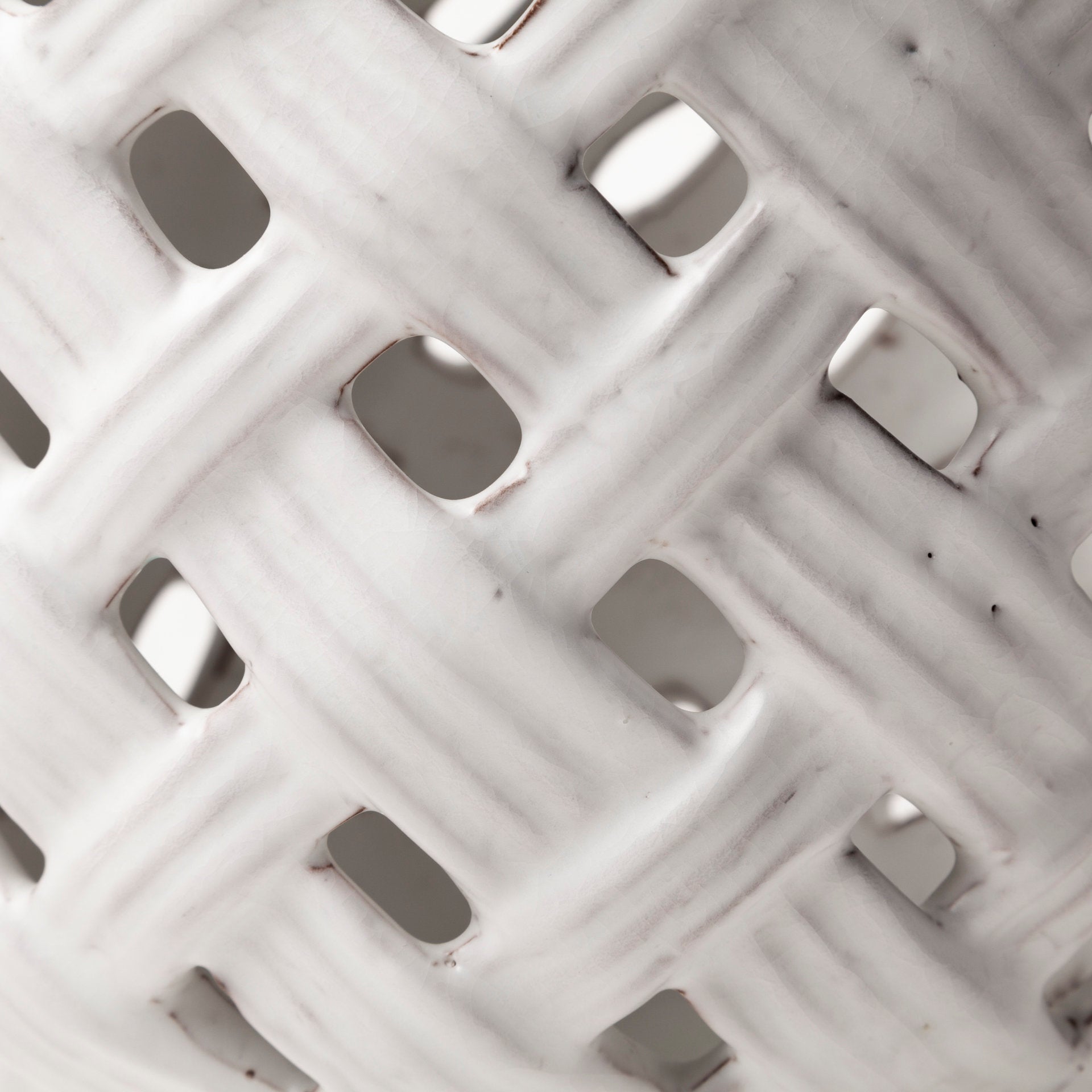 The Forillon is finished in a spectacular white glaze with a lattice pattern, making it a stunning vase that is sure to turn heads
