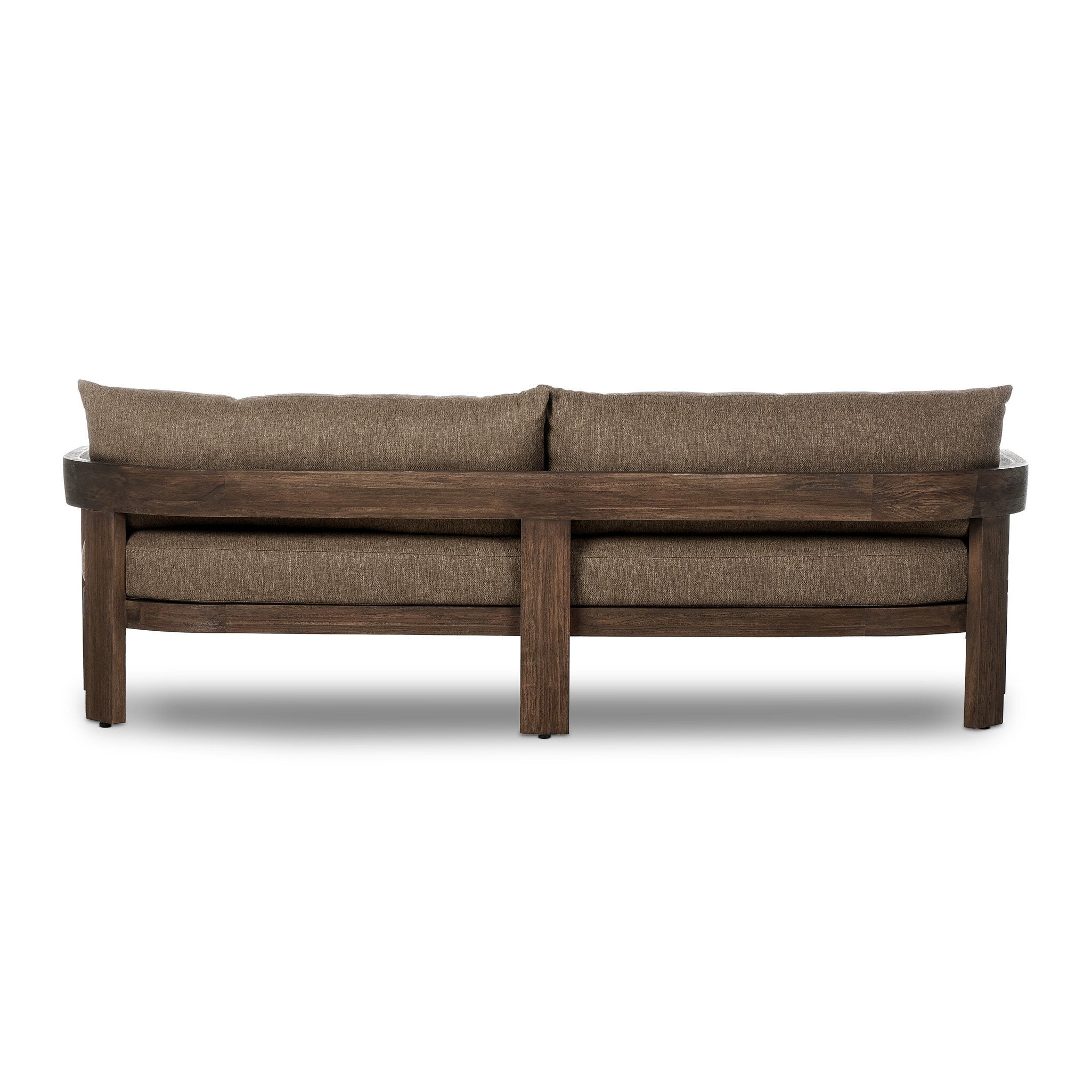 Warm beige upholstery and FSC-certified teak framing form a simple barrel back outdoor sofa, complemented by softened edges and a fluid shape for a classic look. Cover or store inside during inclement weather and when not in use.