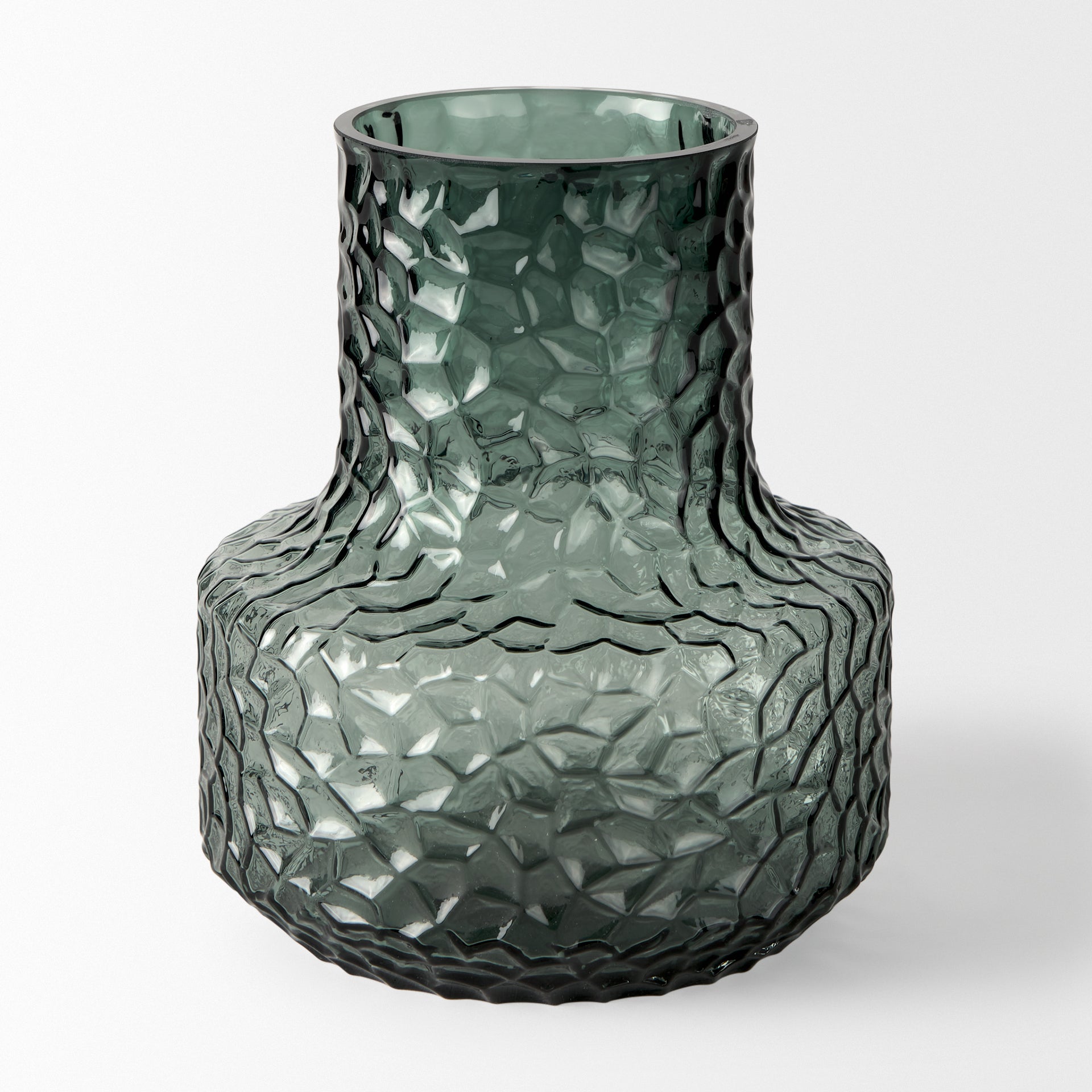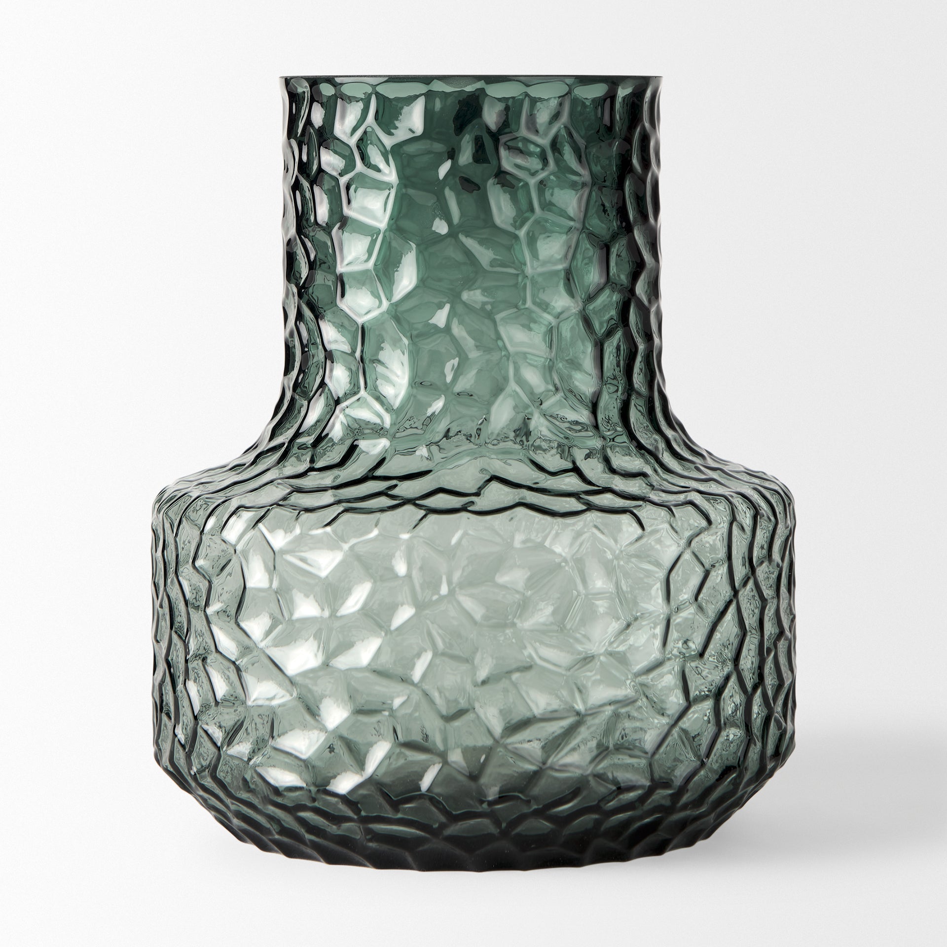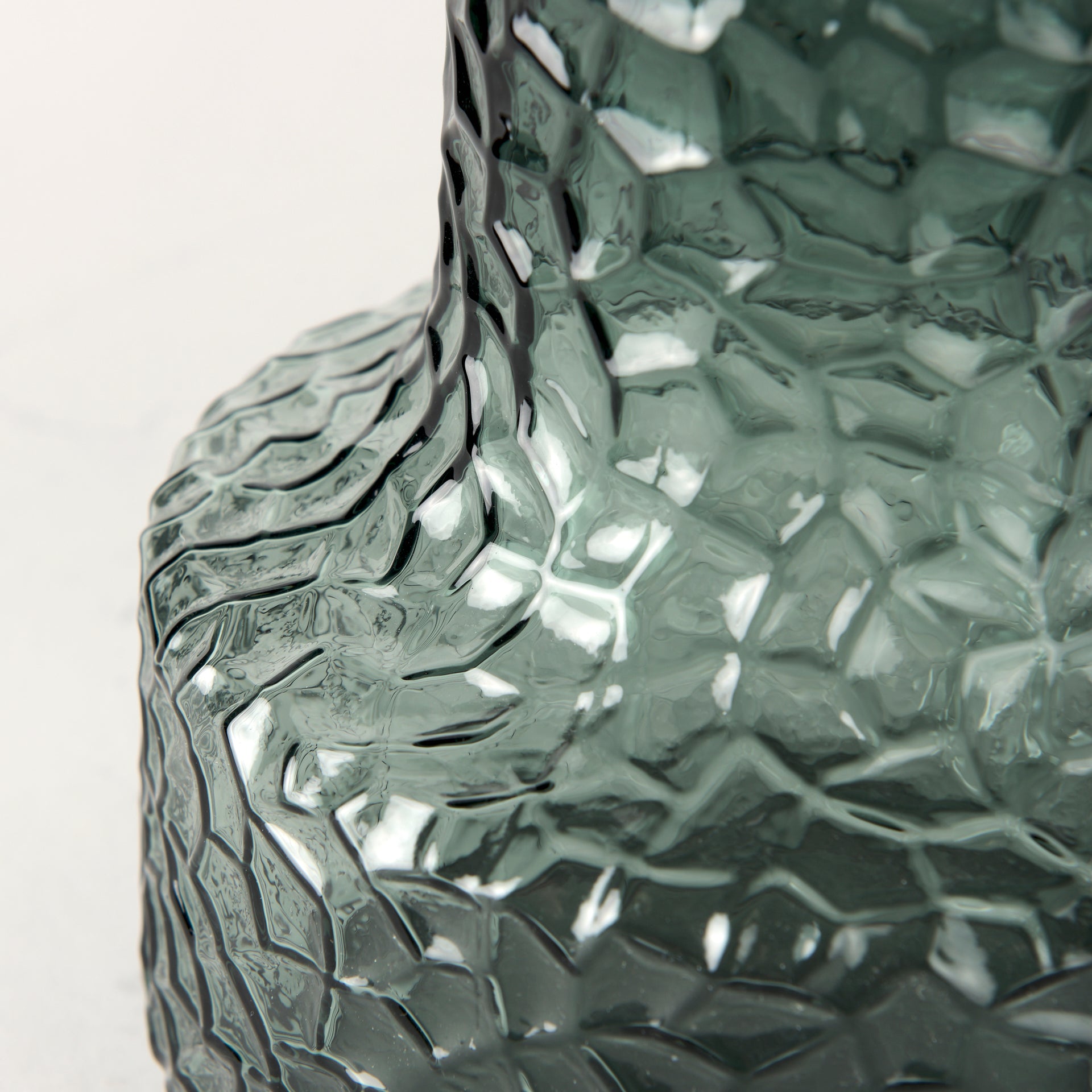 The Jolene Vase is a pebbled translucent green glass vase. These can be used to house favorite botanicals, or display on their own as decorative accessories to add color and texture to a space.