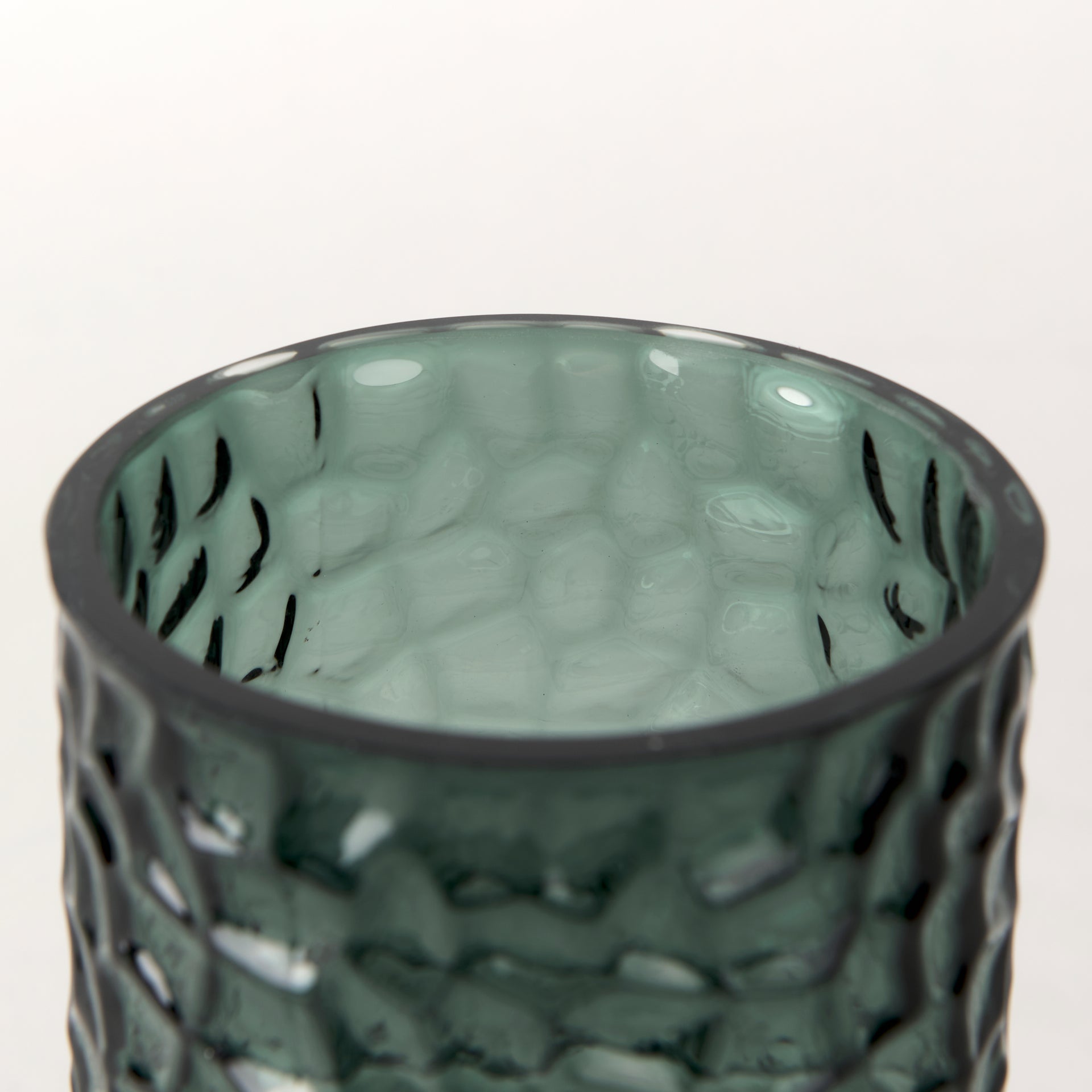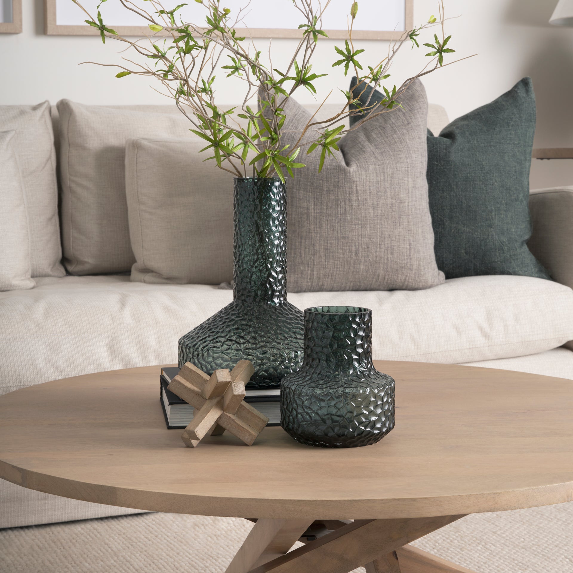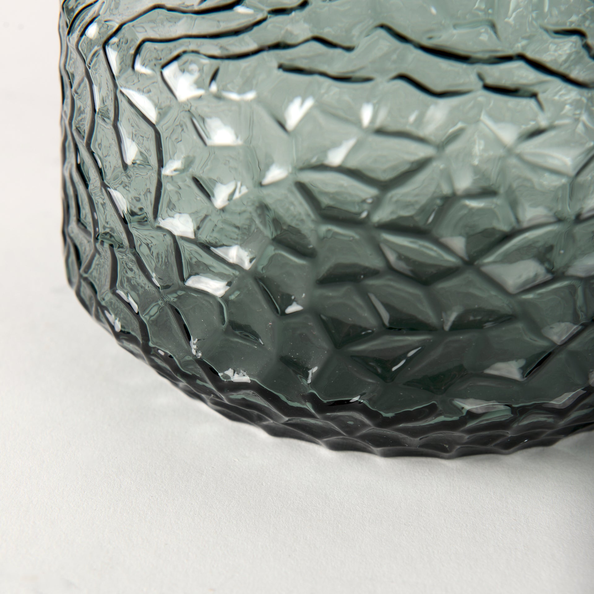 The Jolene Vase is a pebbled translucent green glass vase. These can be used to house favorite botanicals, or display on their own as decorative accessories to add color and texture to a space.