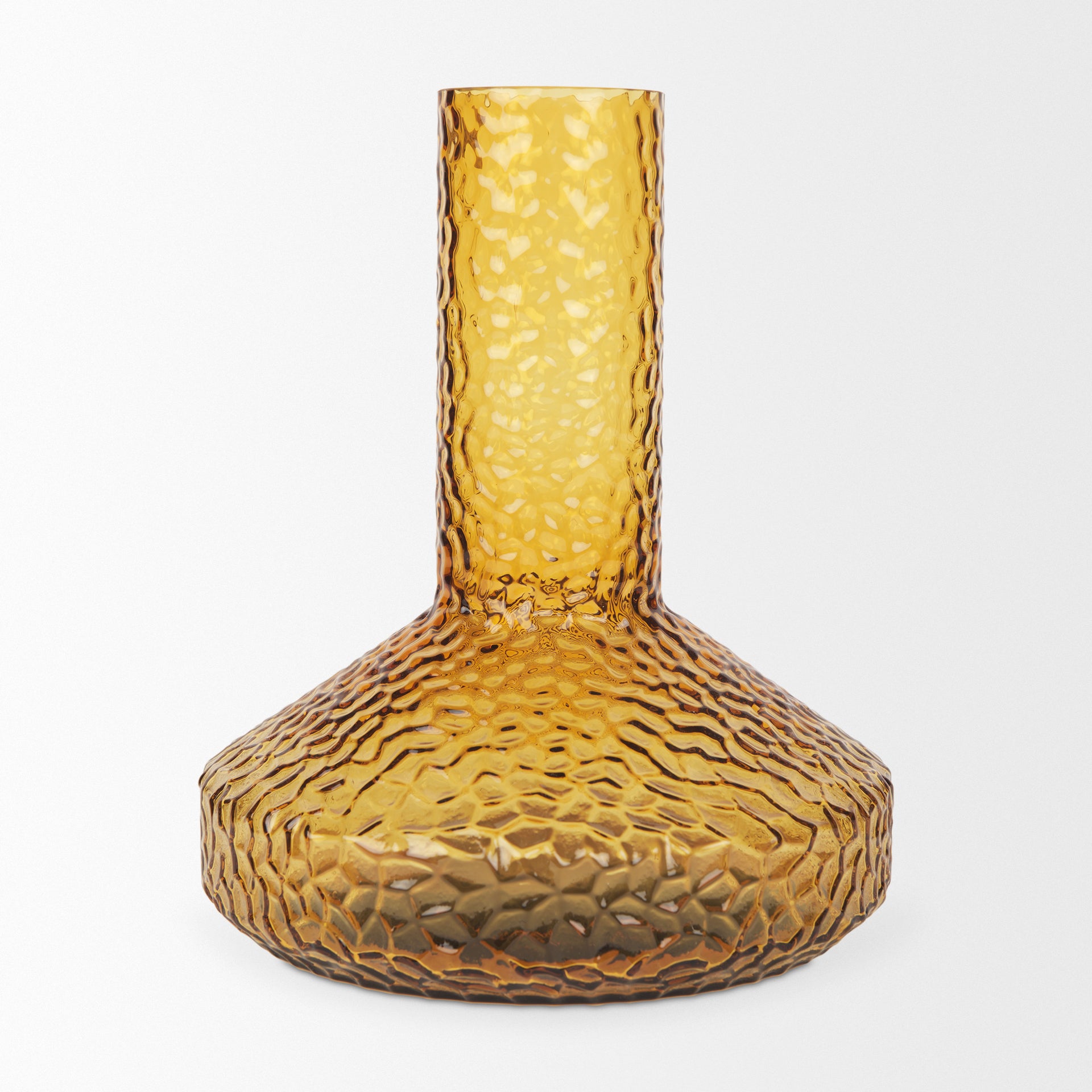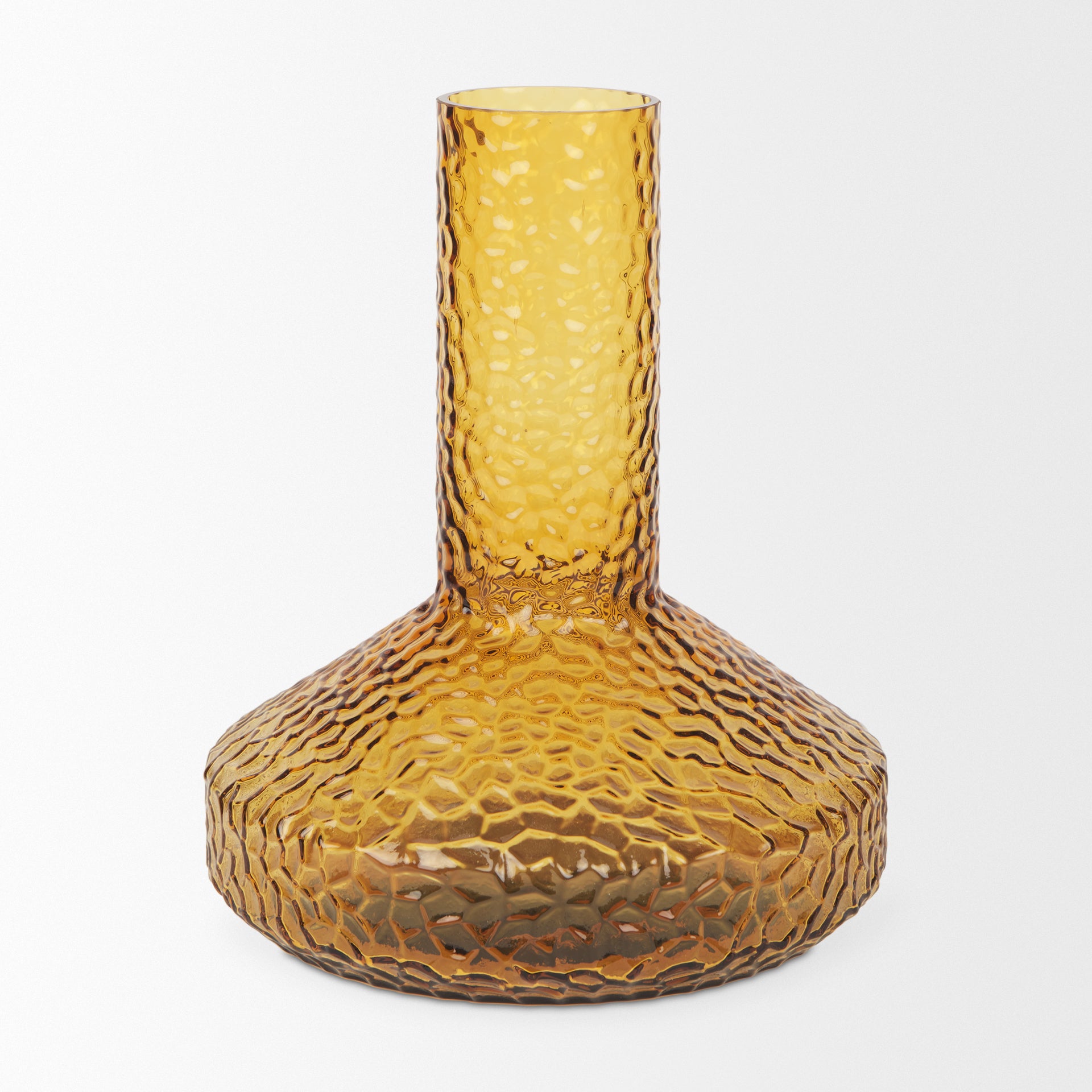 The Jolene Vase is made of transluscent amber pebbled glass. These can be used to house favorite botanicals, or display bare as decorative accessories to add color and texture in a space.