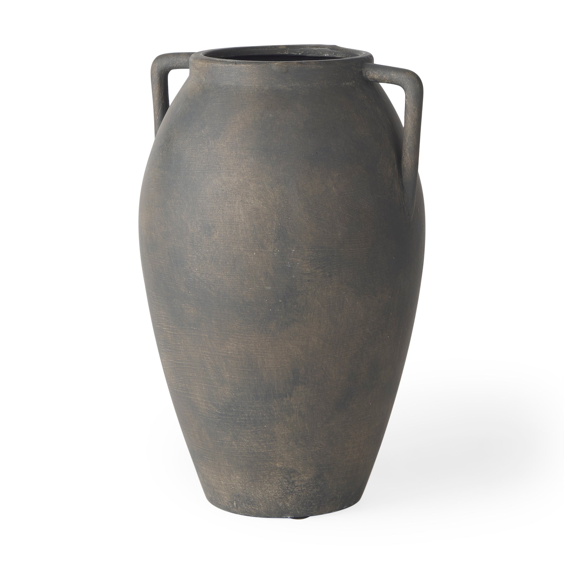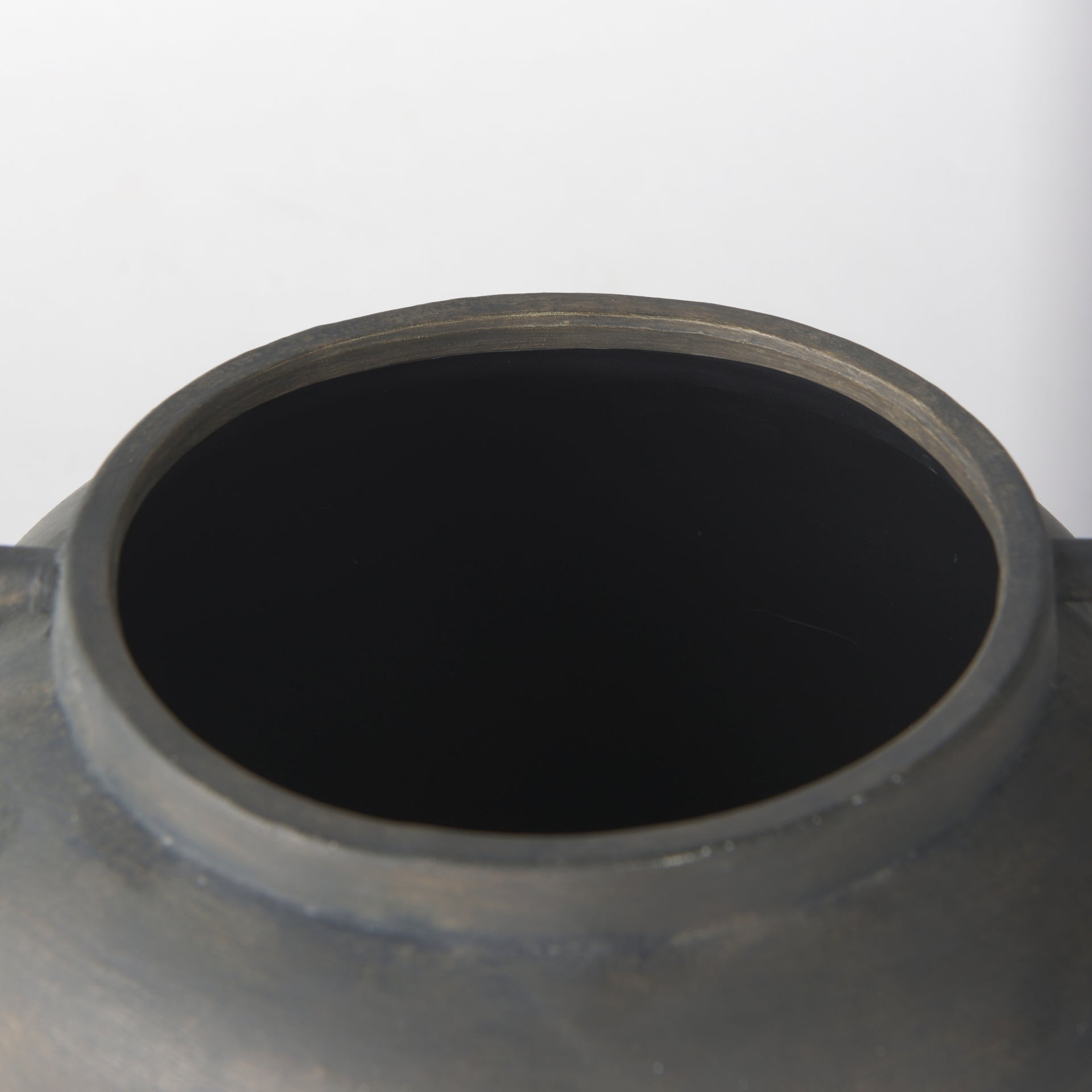 A contemporary vase with a wide silhouette and triangular ears finished in a deep, earthy matte brown.