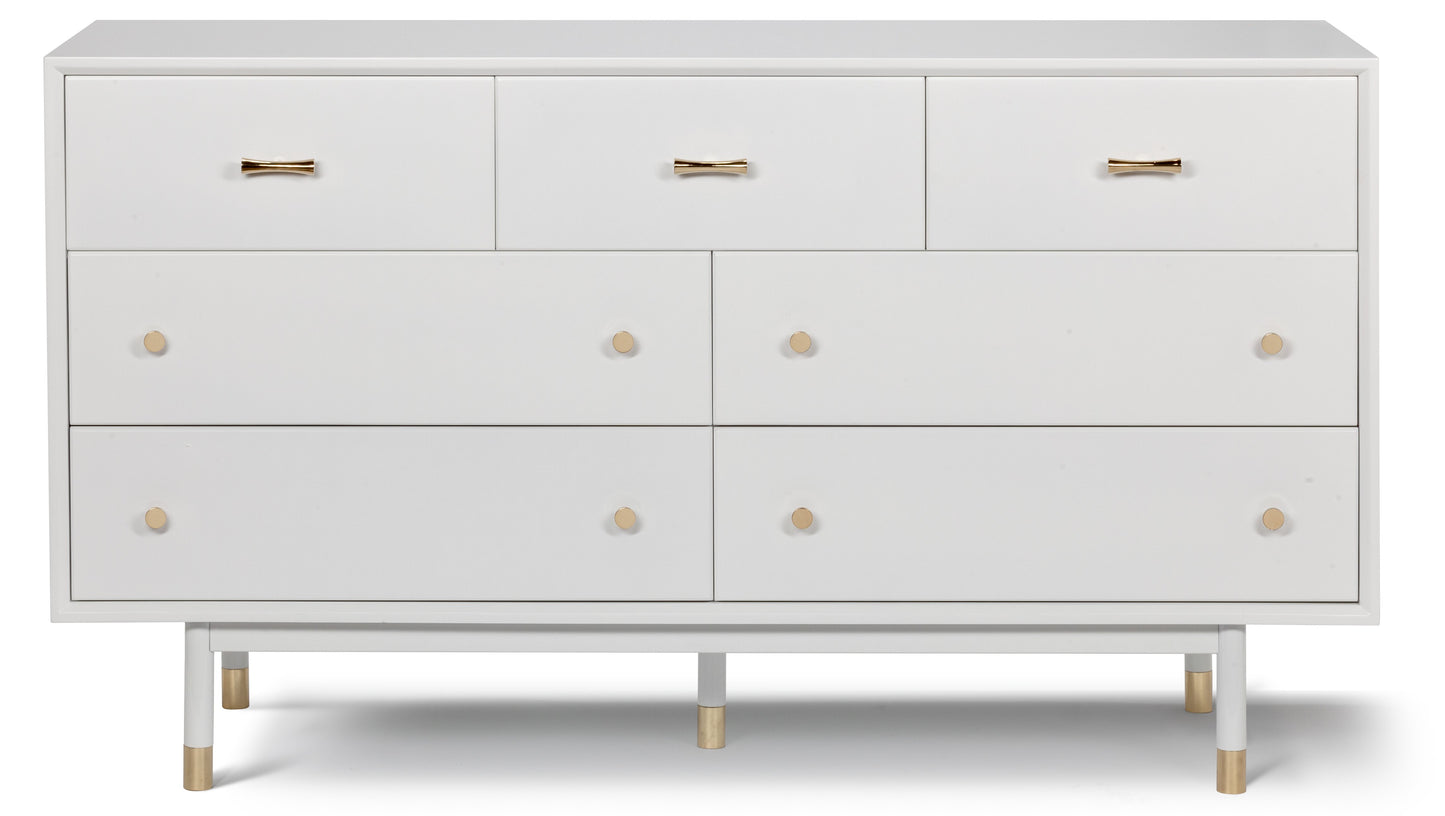 From chic gold knobs to tubing on legs, it's all in the detail for this line. Lofted on slender legs, this dresser is made of solid wood in satin white finish for light and casual look with a significant dose of charm.