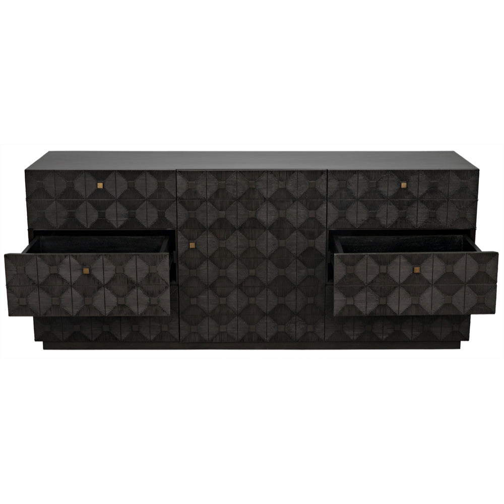 Carved of the most revered hardwood, mahogany, three sides of this exquisite dresser are adorned with decorative geometrical patterns. Its central cupboard opens to reveal three shelves and is itself surrounded by six generous drawers.