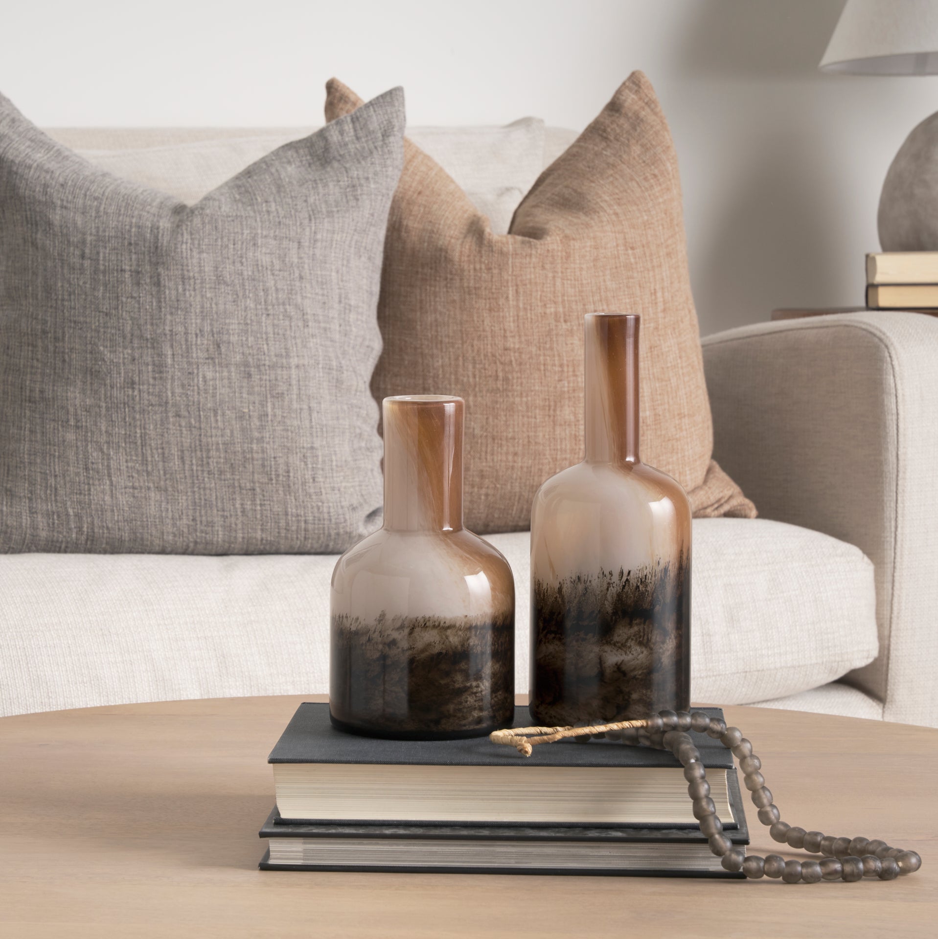 Marans glass vase is a smooth, polished amber glass vase with soft swirls of dark brown and cream. Heavy and substantial; you can feel the quality of the glass. Display the Marans Vases on their own or style with your favorite flowers and botanicals.
