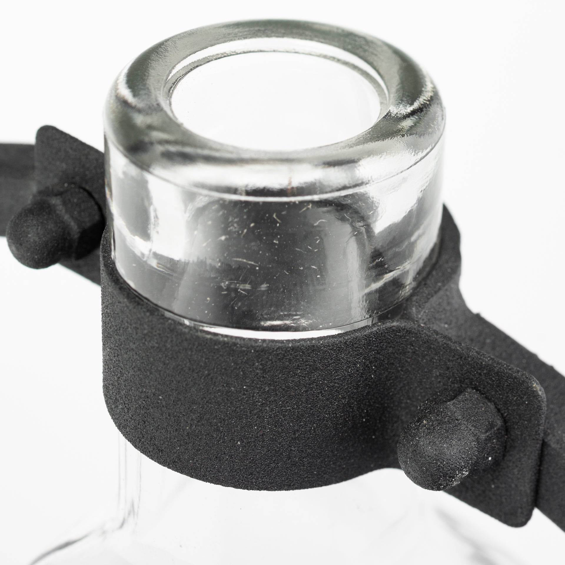 Sleek and architectural, this tall bottle-style vase features black metal framing around a clear glass body. It makes a striking visual statement whether styled with florals or left empty as decor.