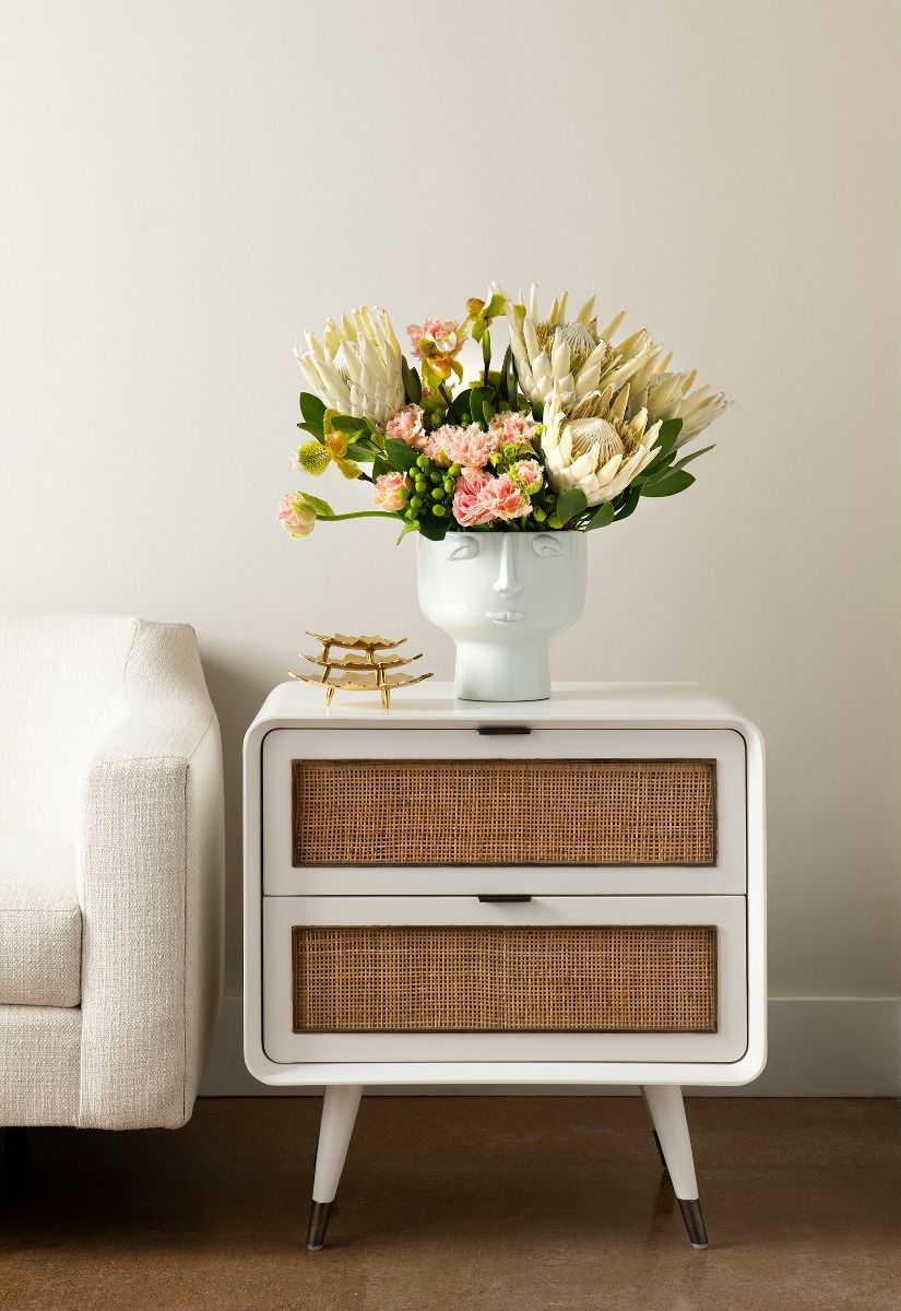 For playful and modern tastes, the Nico Vase is a must. Crafted from fine porcelain with a lightly glazed finish, the vase is a surrealist embodiment of a face, boasting striking features, including a nose, eyes, and mouth. The whimsical details come together to communicate a bright and joyous expression. It tapers down into a thinner base, perfectly resembling a neck. While the Nico certainly has enough personality for displaying solo, it turns into a truly fabulous masterpiece when filled with a bouquet-think of it as giving it a new floral hairstyle each time you switch it up.