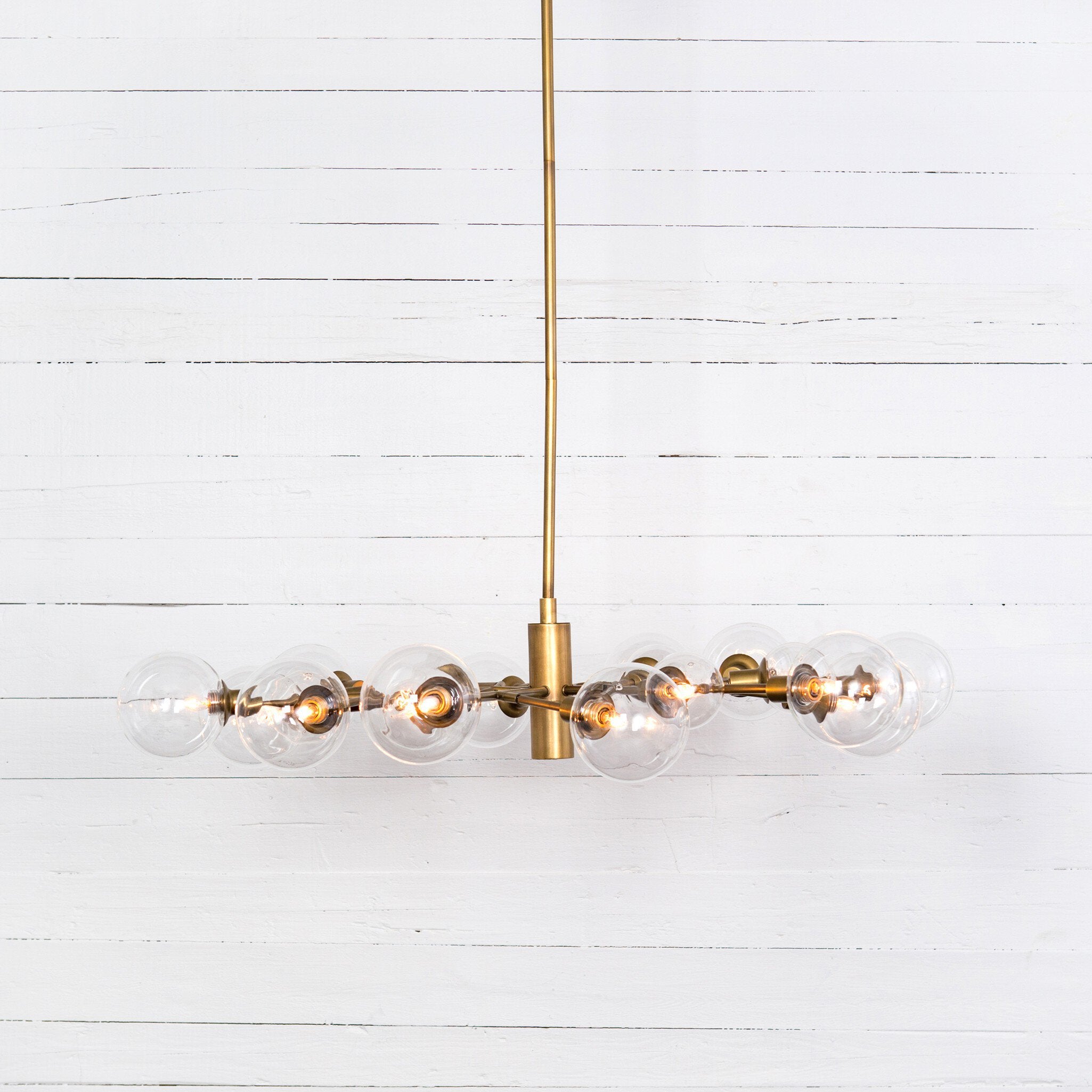 A unique cluster of sculptural iron arms are finished in a matte brass, natural matte, matte black for edgy elegance. Soft, mood-setting clear glass bulbs included plus three 12" pipes. Body length adjustable from 9" to "24".