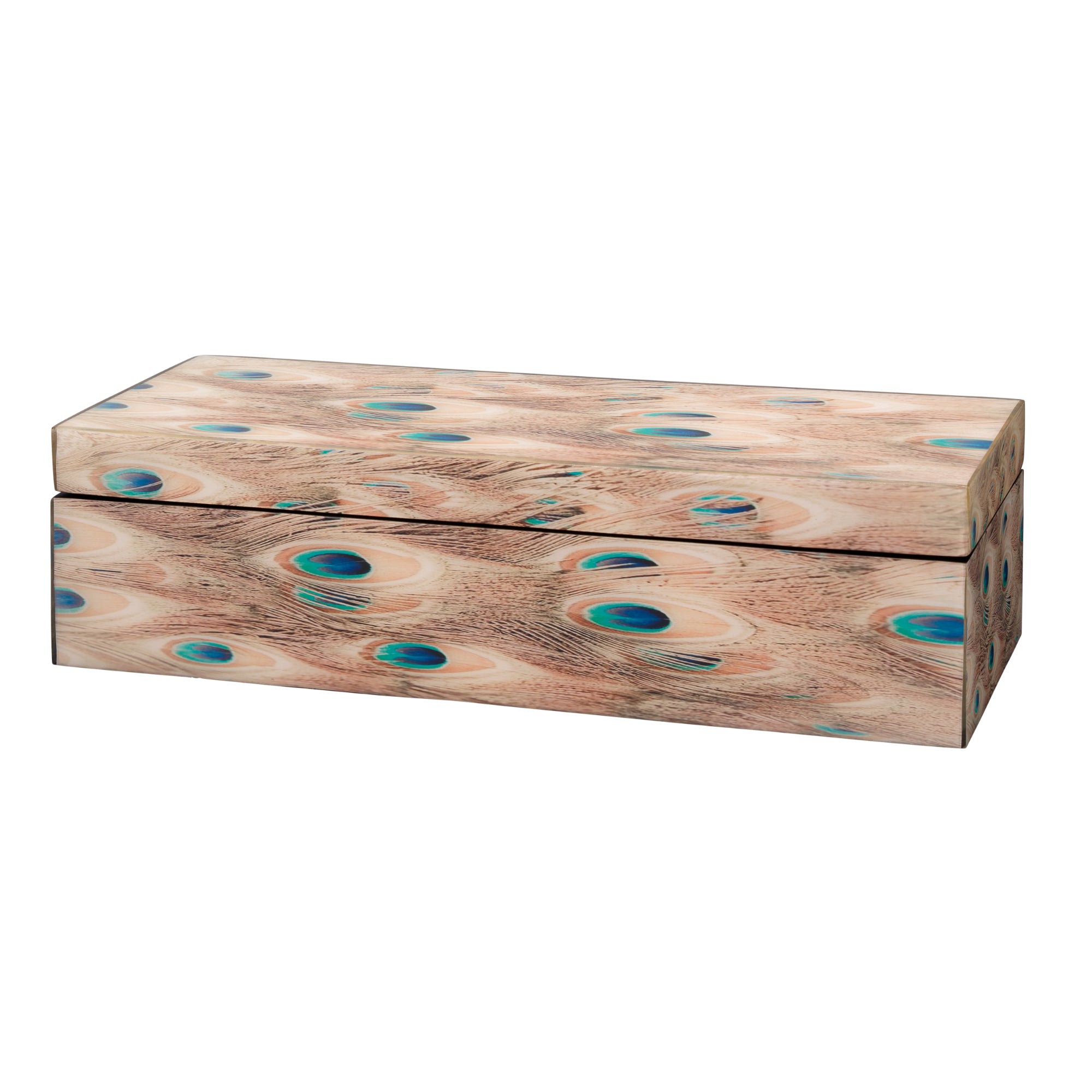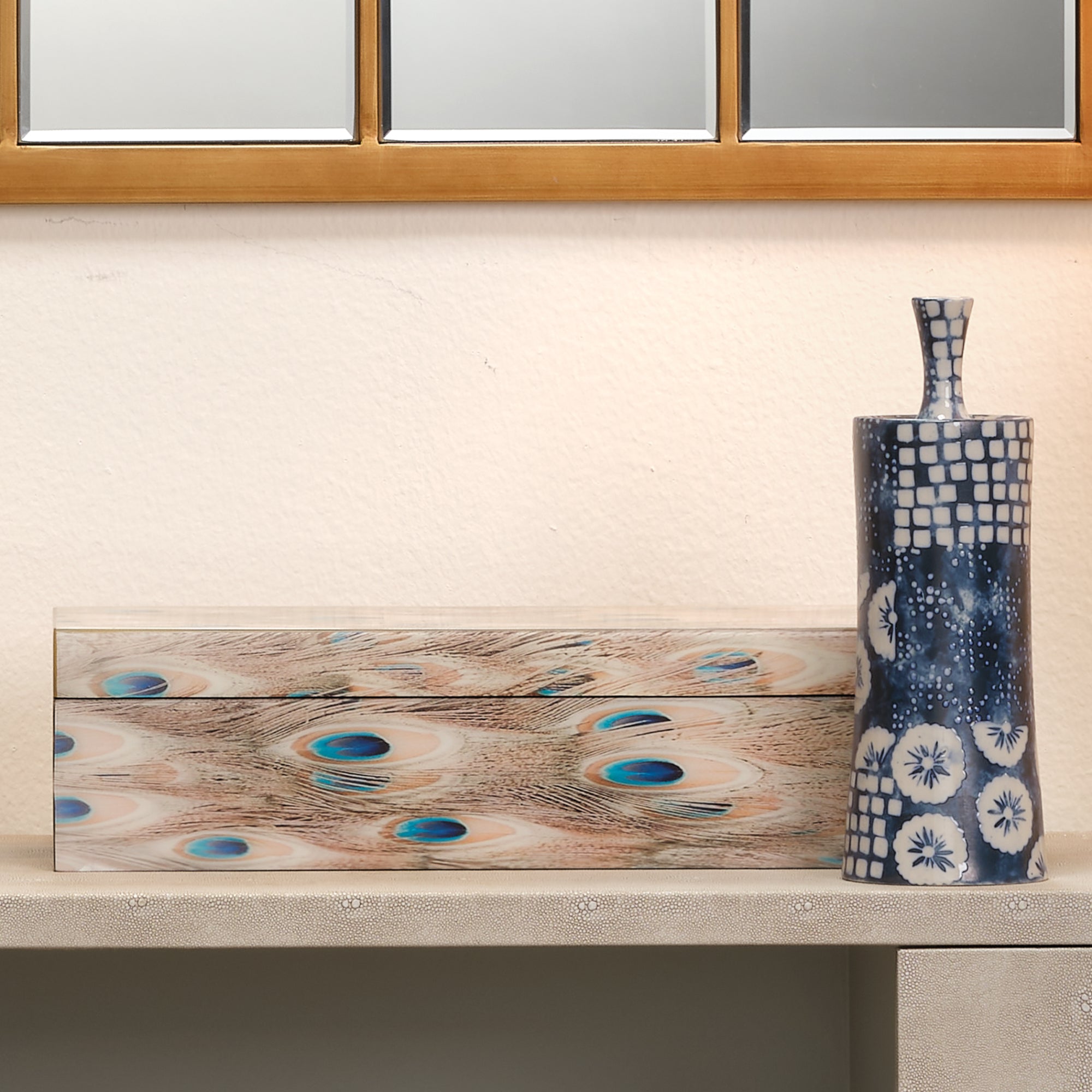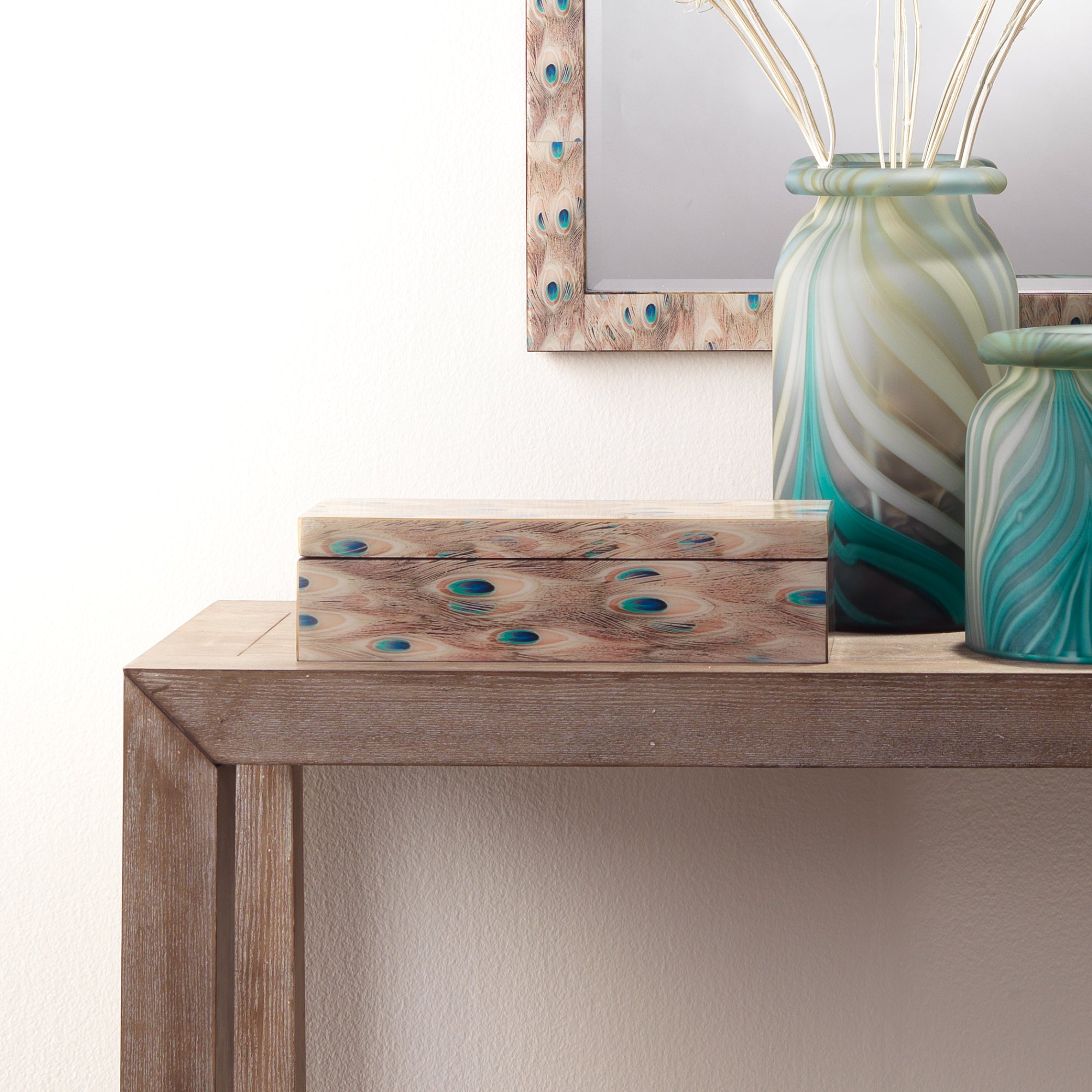 An elegant accent for your home or office, the Peacock box is a beautiful piece of art that will become a treasured keepsake. The soft palette and lovely peacock designs are accented with bright pops of blue and aqua, adding a pop of color to any room!