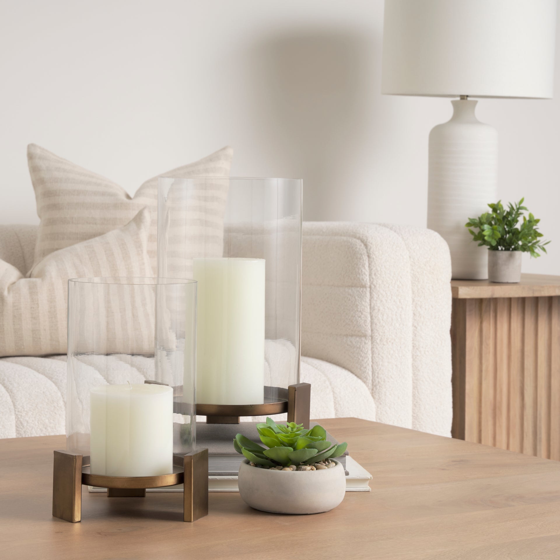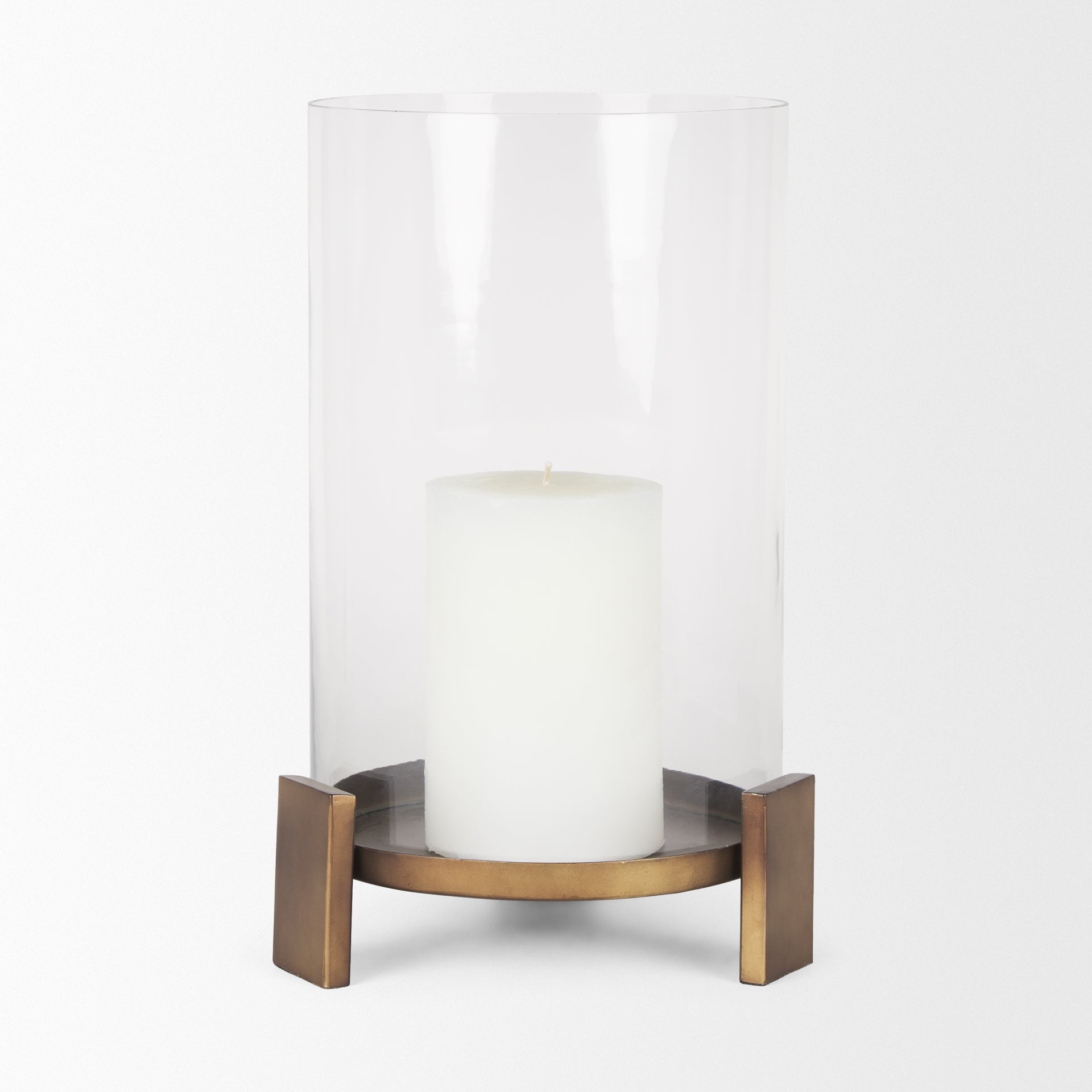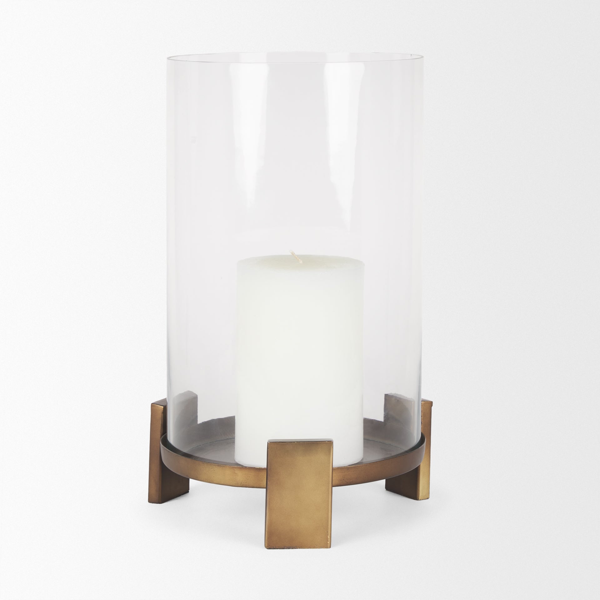 Price is a hurricane candleholder with a base that has been crafted from cast aluminum and finished in a textured antiqued gold that lends a sense of refined yet understated elegance. Its circular base holds a pillar candle and is supported by three slim rectangular feet for stability and style. Encased within a sleek, clear glass cylinder hurricane, Price creates a mesmerizing display of light and shadow, perfect for enhancing any ambiance. Available in two sizes and two finishes.