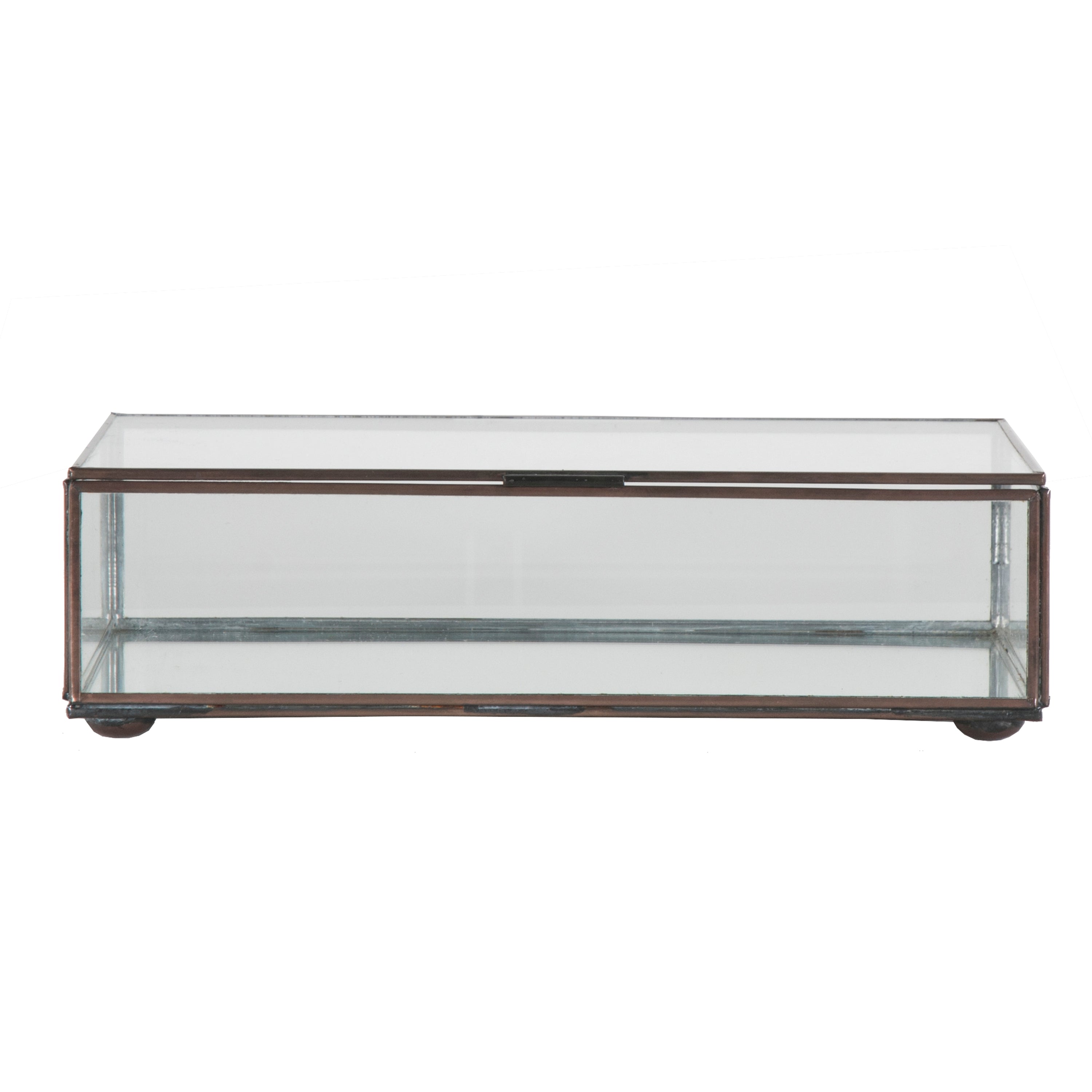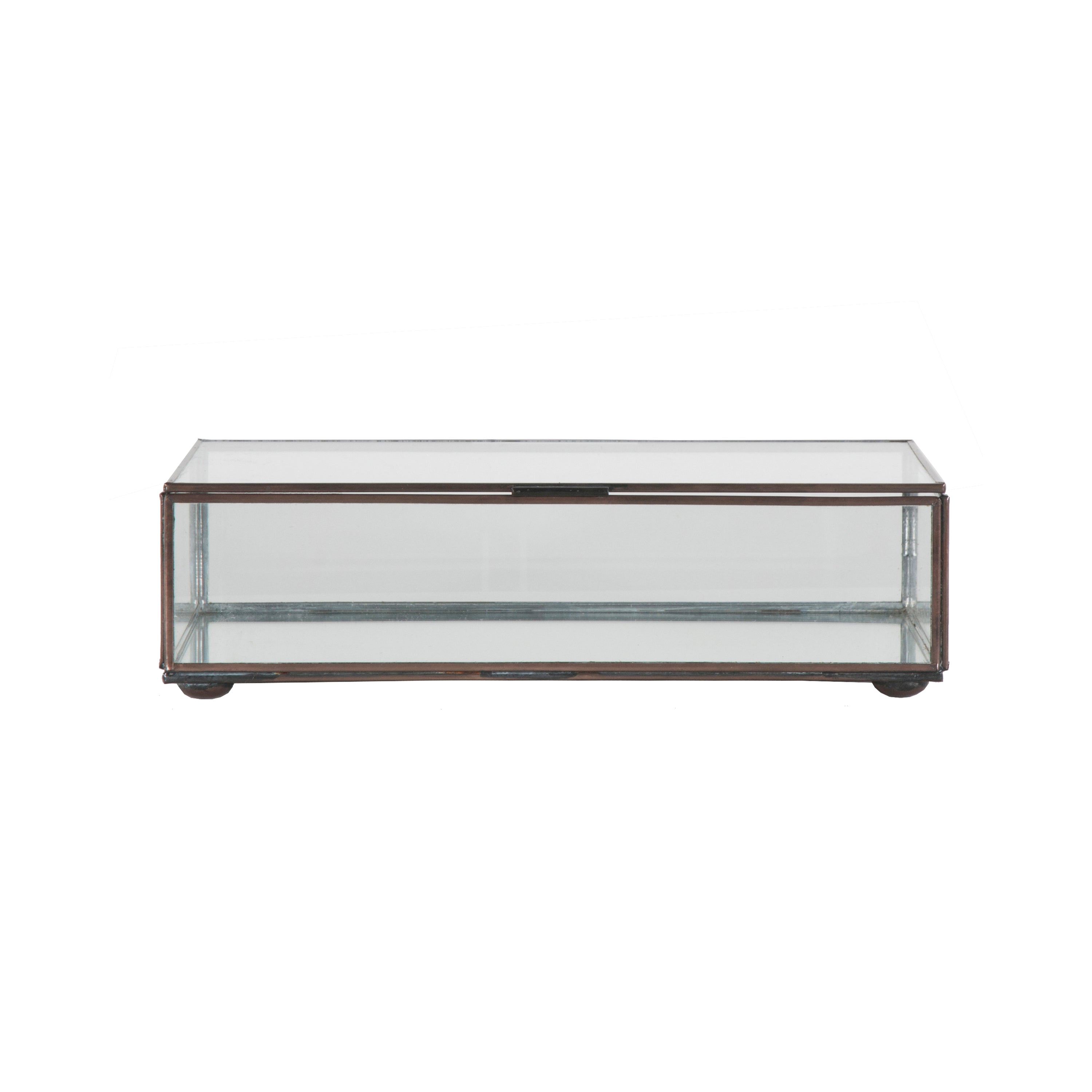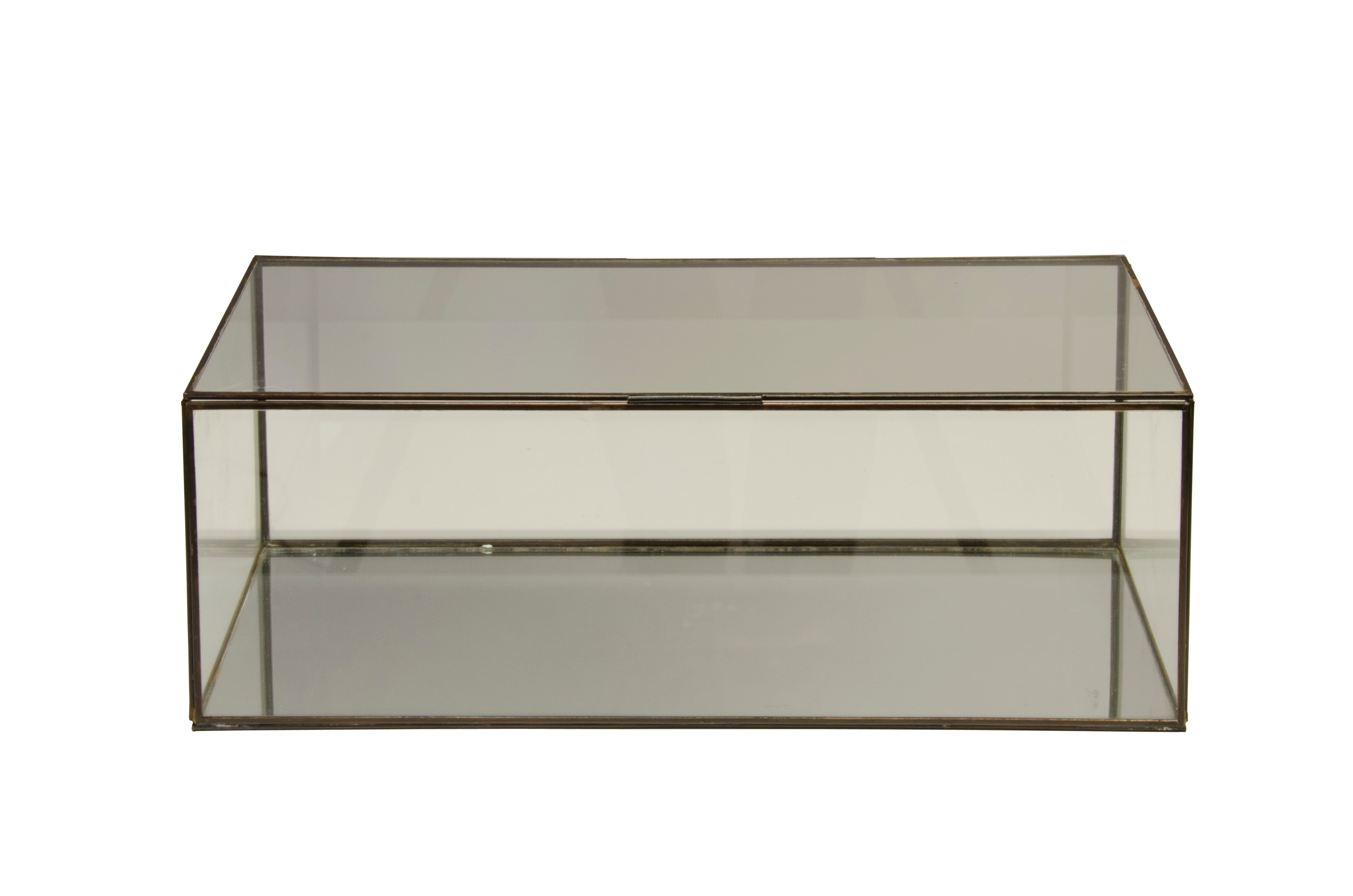 Create a stunning display with this hinged, rectangular clear glass box with antique brass edges. Perfect when displayed as a standalone accent, or group with our different sized glass boxes (BOX CLRM AND CLRS) as a showcase for jewelry or other collectibles.