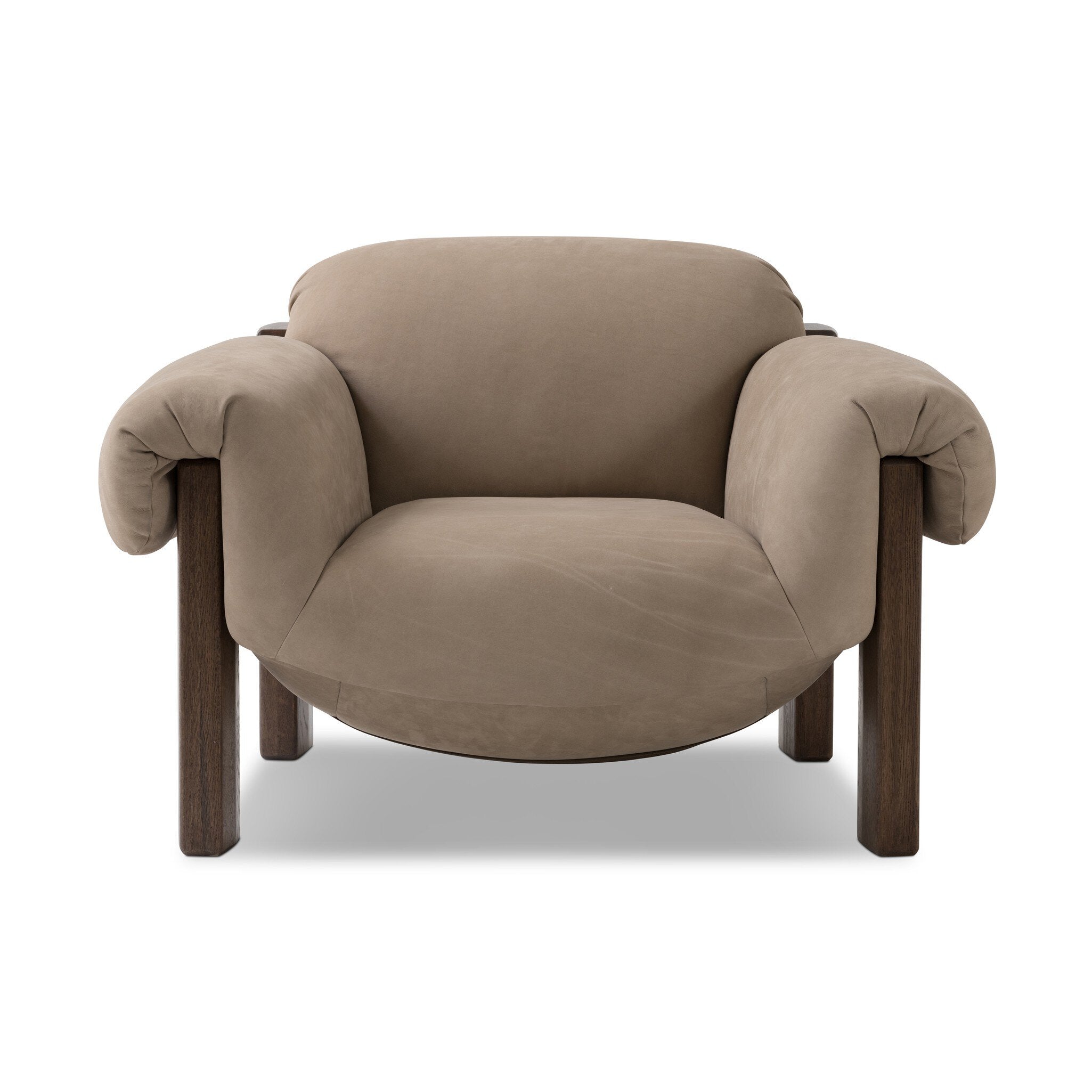 A cozy spot for lounging and curling up with a good book. This statement-making chair features large overflowing cushioning that wraps around the arms and back. Designed with S spring construction and a solid oak frame. Upholstered in a smooth sueded leather with contrasting sling seating strap beneath.