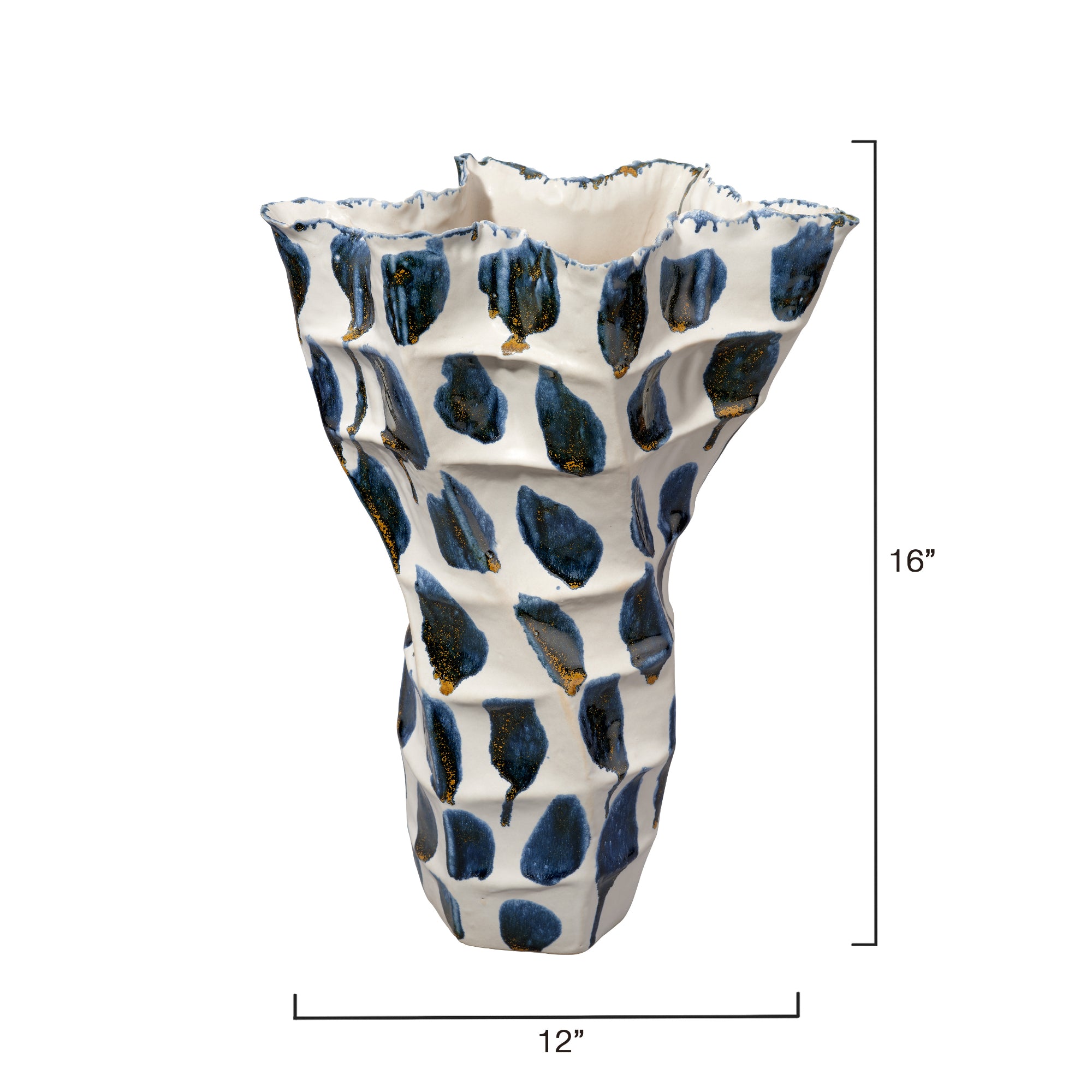 Artfully handcrafted from fine ceramic, these bright and cheerful vessels showcase bold splashes of blue reactive glaze. To enhance their organic shapes, the ruffled openings are rimmed in the same hue. The glazing technique reacts uniquely on each piece, ensuring that no two are completely identical.