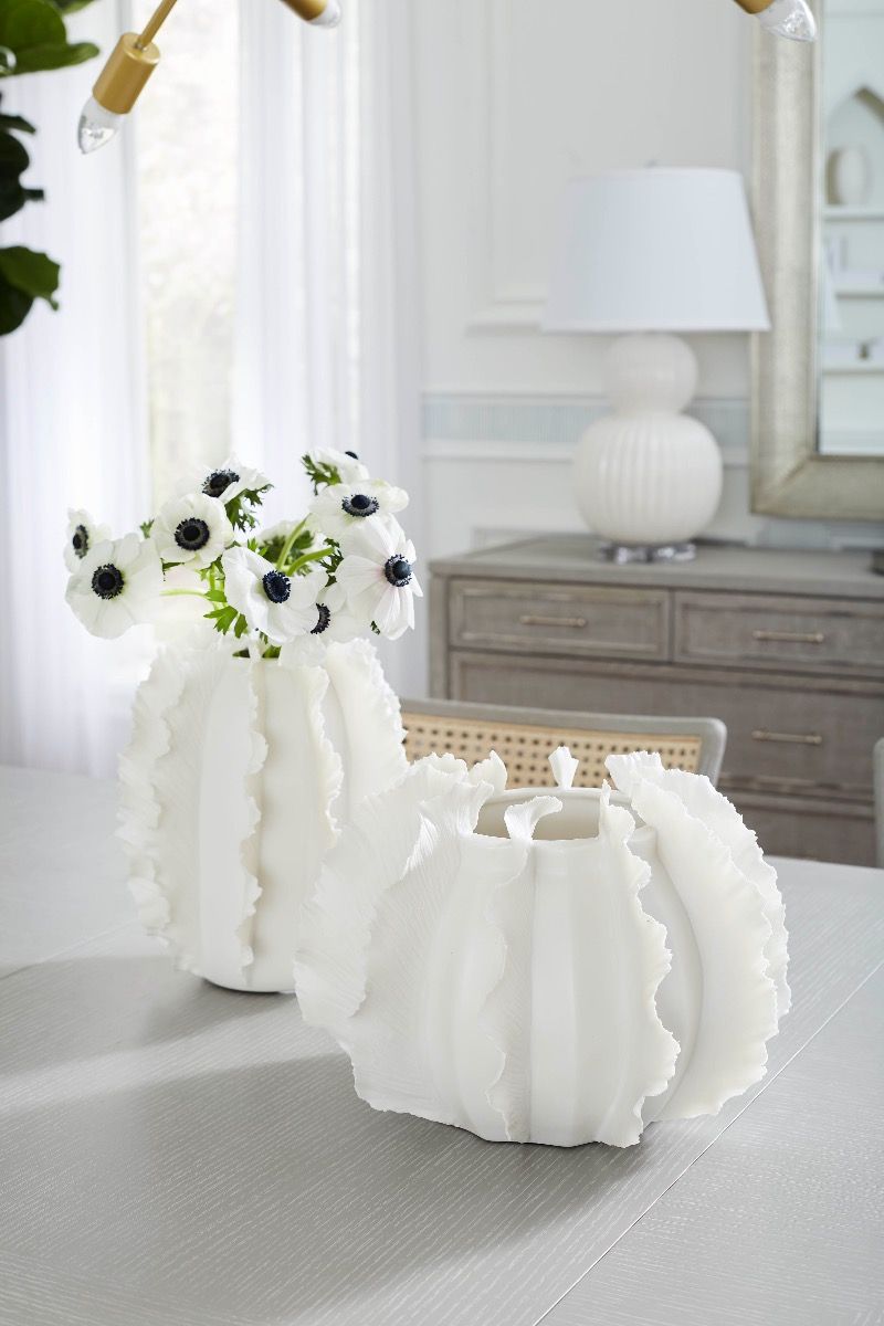 The romantic nature of the Spring Flower Vases invites you to display beautiful floral arrangements on any surface of your home. Delicate rippling petals, which resemble the natural folds of a Damask Rose, surround the outer surface of each vase to add intricate movement to its form. The Matte Glazed Blanc de Chine finish adds a soft touch of elegance. Offered in two sizes, they can be used individually or paired together for a graceful decorative display.