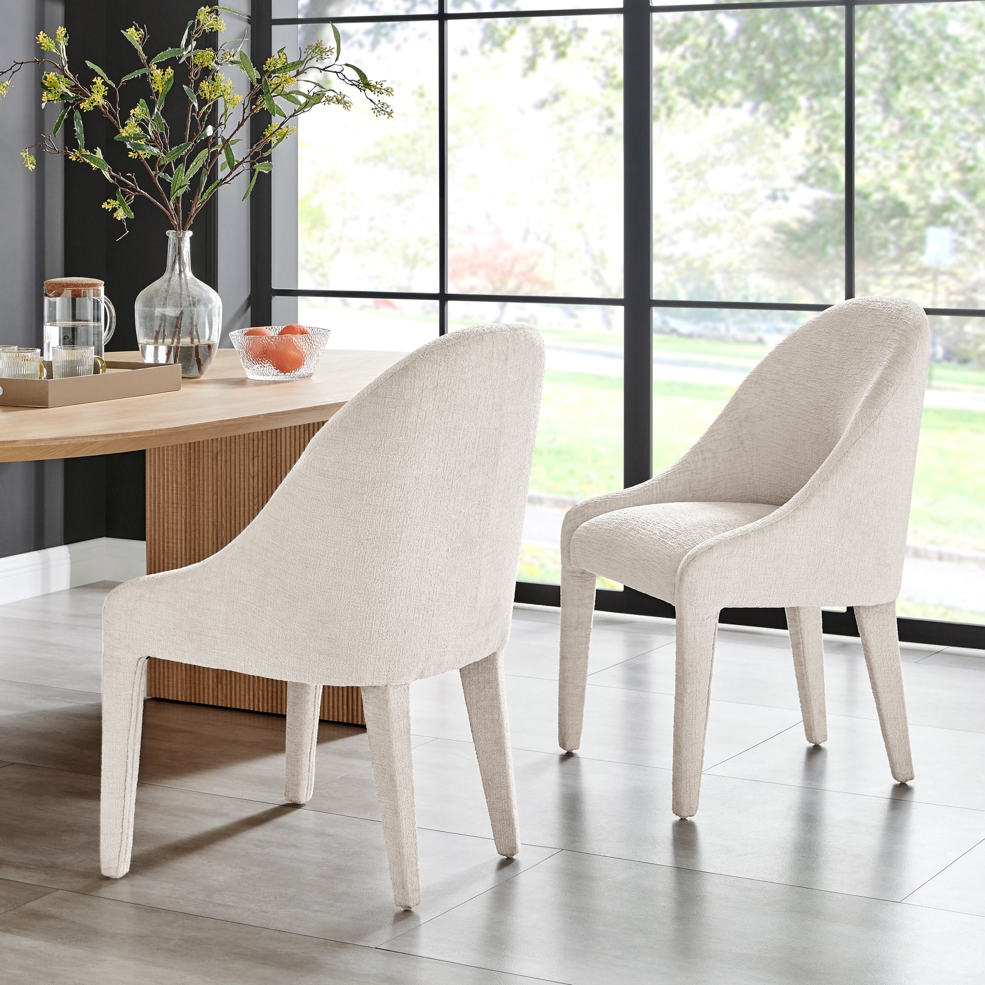 Elevate your space with elegance. The Stacy side chair collection adds a luxe vibe with its fully upholstered monochrome beige design. The curved backrest gracefully extends into the arms, enhancing its refined look. Equipped with a high-density foam cushion for comfort and easy-care polyester fabric, it combines style with practicality.