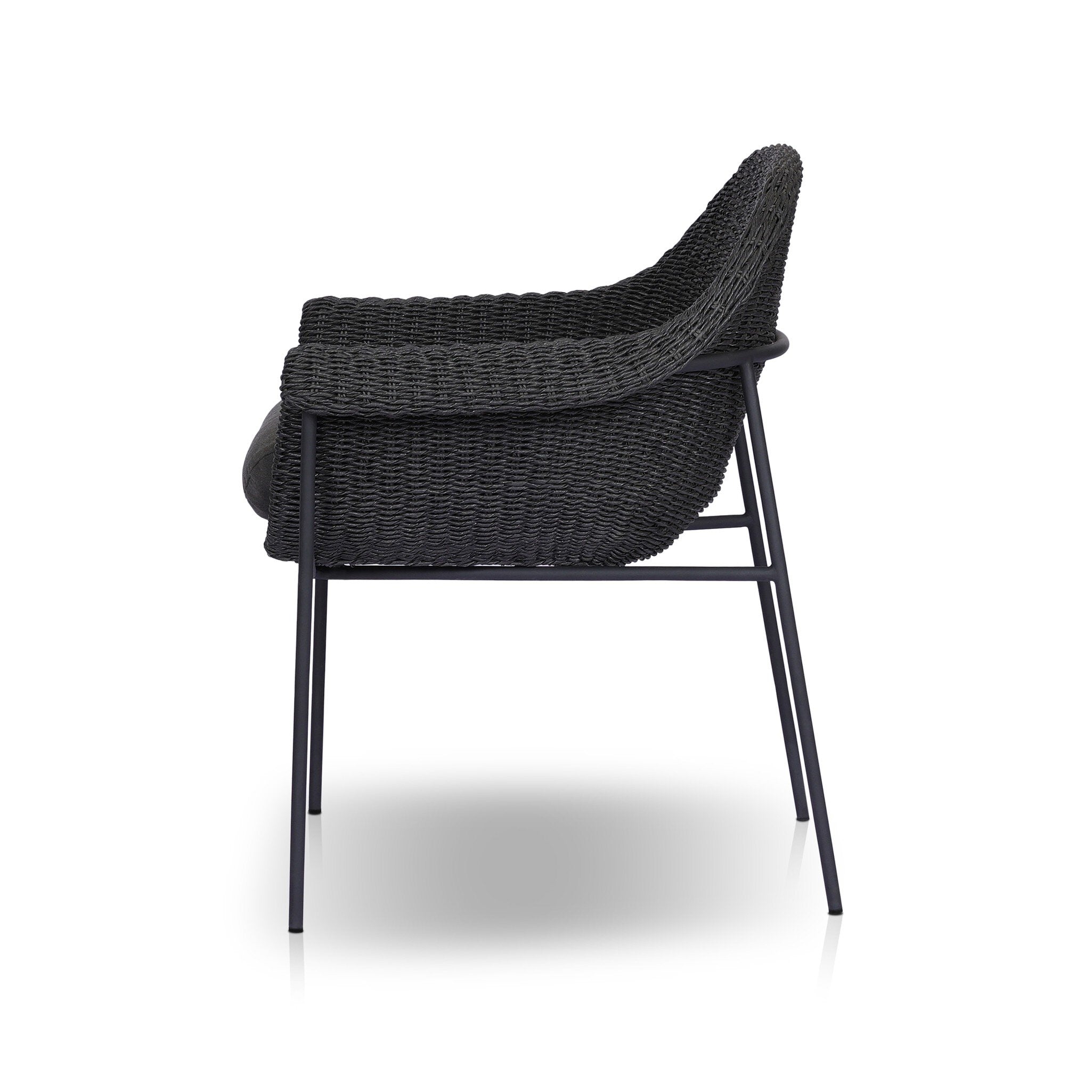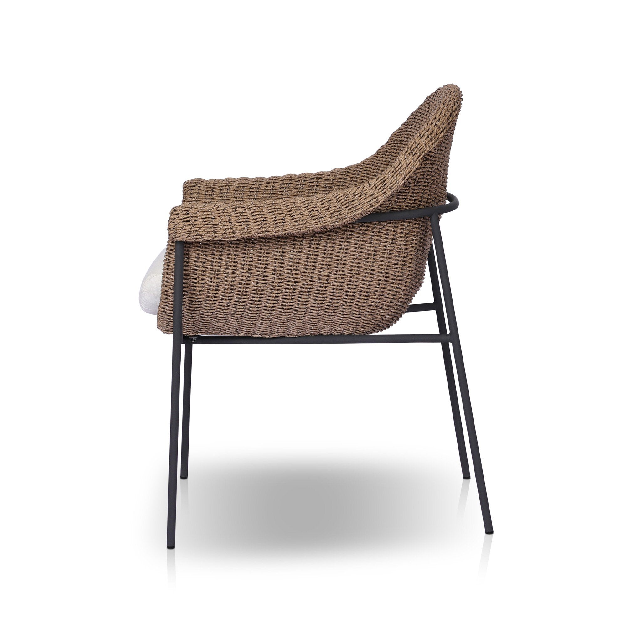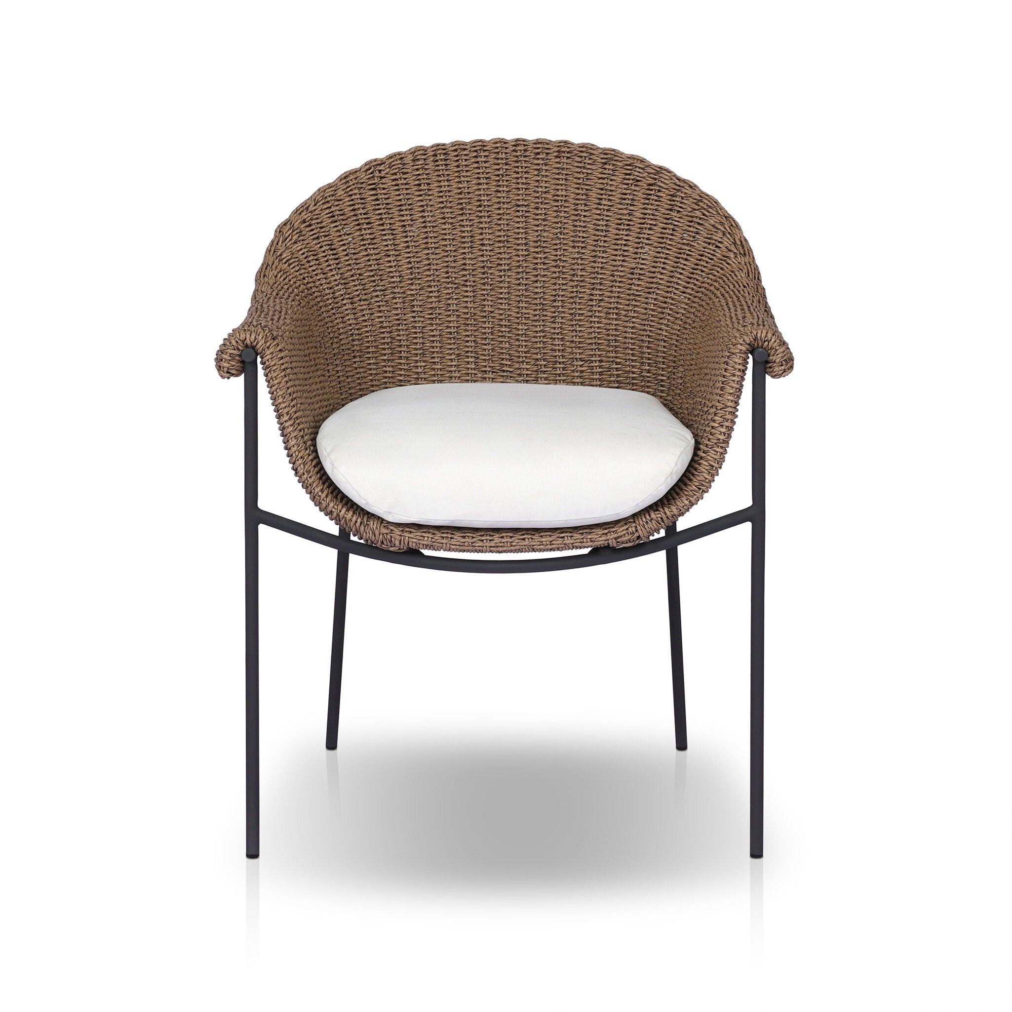 With a curvy silhouette and classic rolled arms, a woven frame brings modern sensibility to this vintage-inspired outdoor dining chair, with an airy iron cradle base for a beautiful balance of scale. Paired with a fully upholstered cushion for a comfortable seat. Cover or store indoors during inclement weather and when not in use.