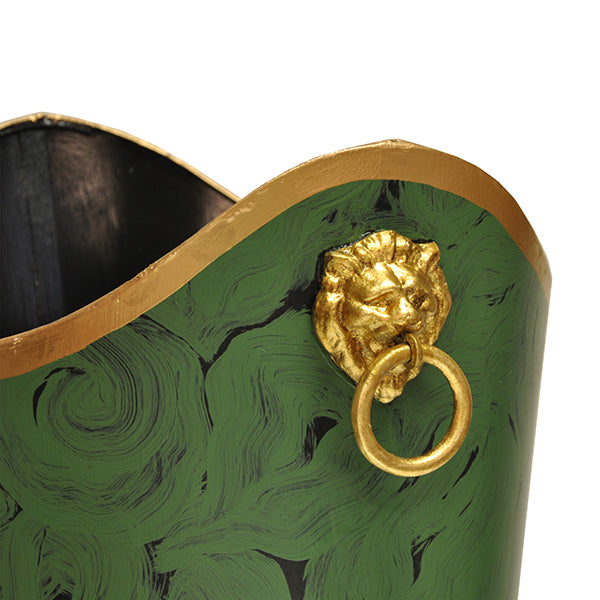 Unexpected details bring surprise and delight to your space and offer a professional finishing touch. This elegant oval wastebasket with raised ends and gold lion handles features a painted emerald green malachite pattern with gold edge detailing.
