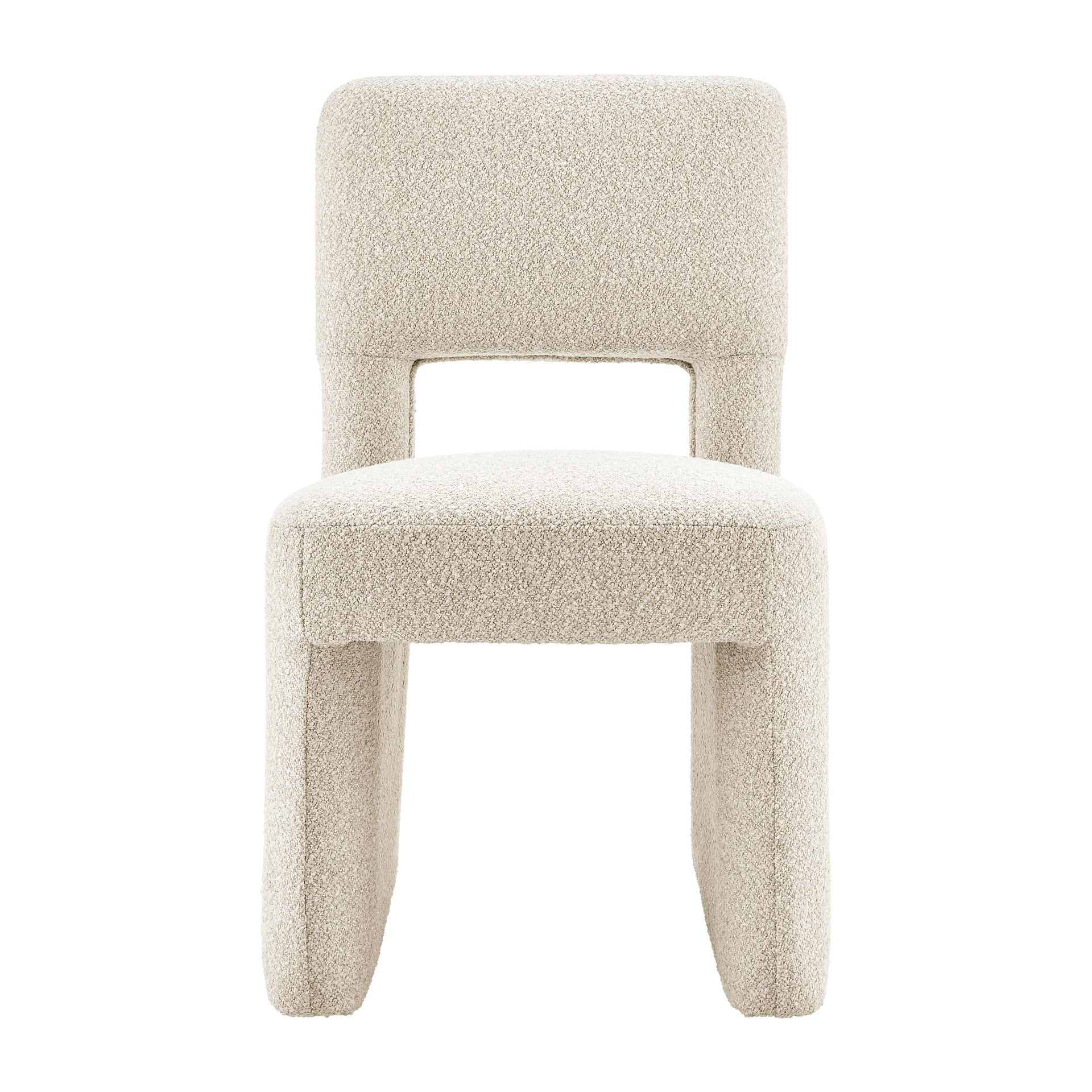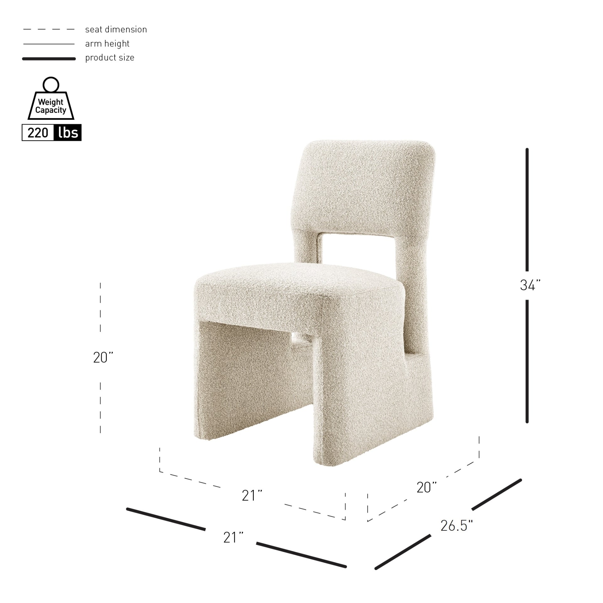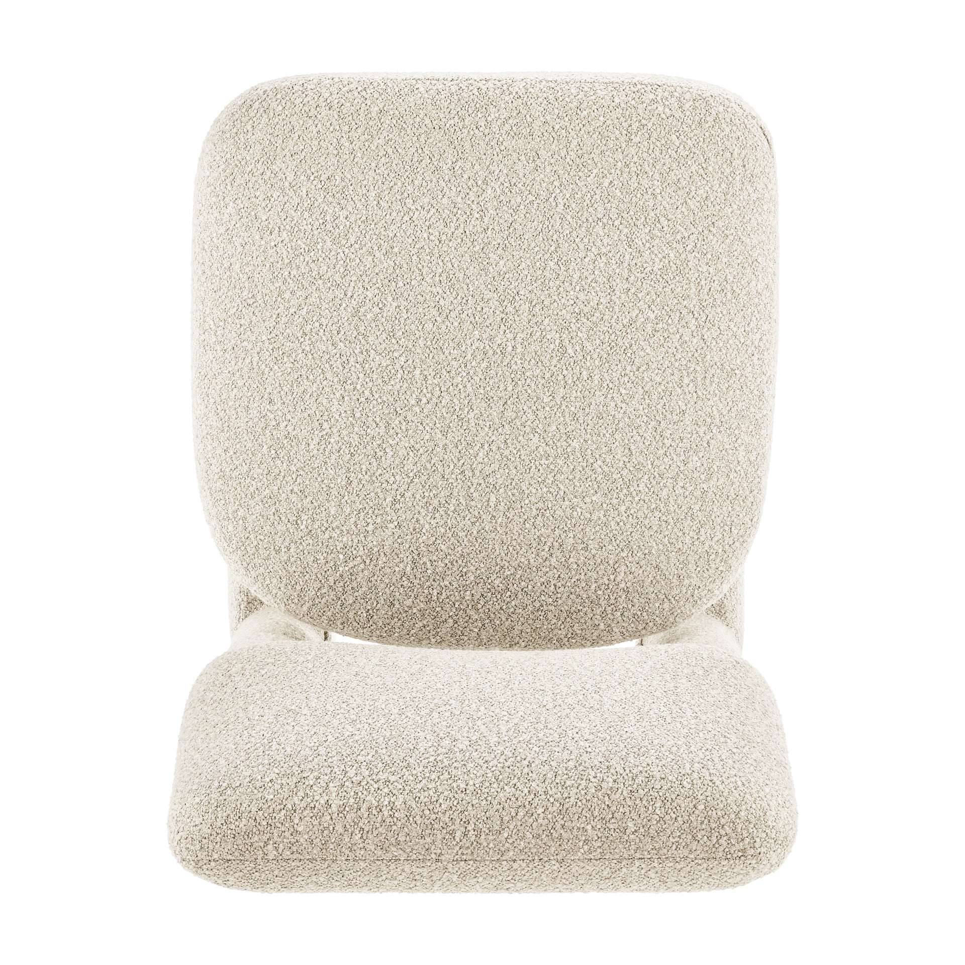 Its well-proportioned seating area on high-density foam cushion also includes quality boucle fabric that fully covers the entire chair